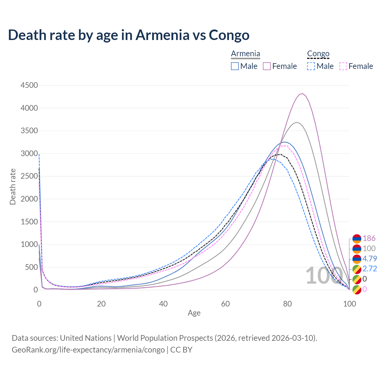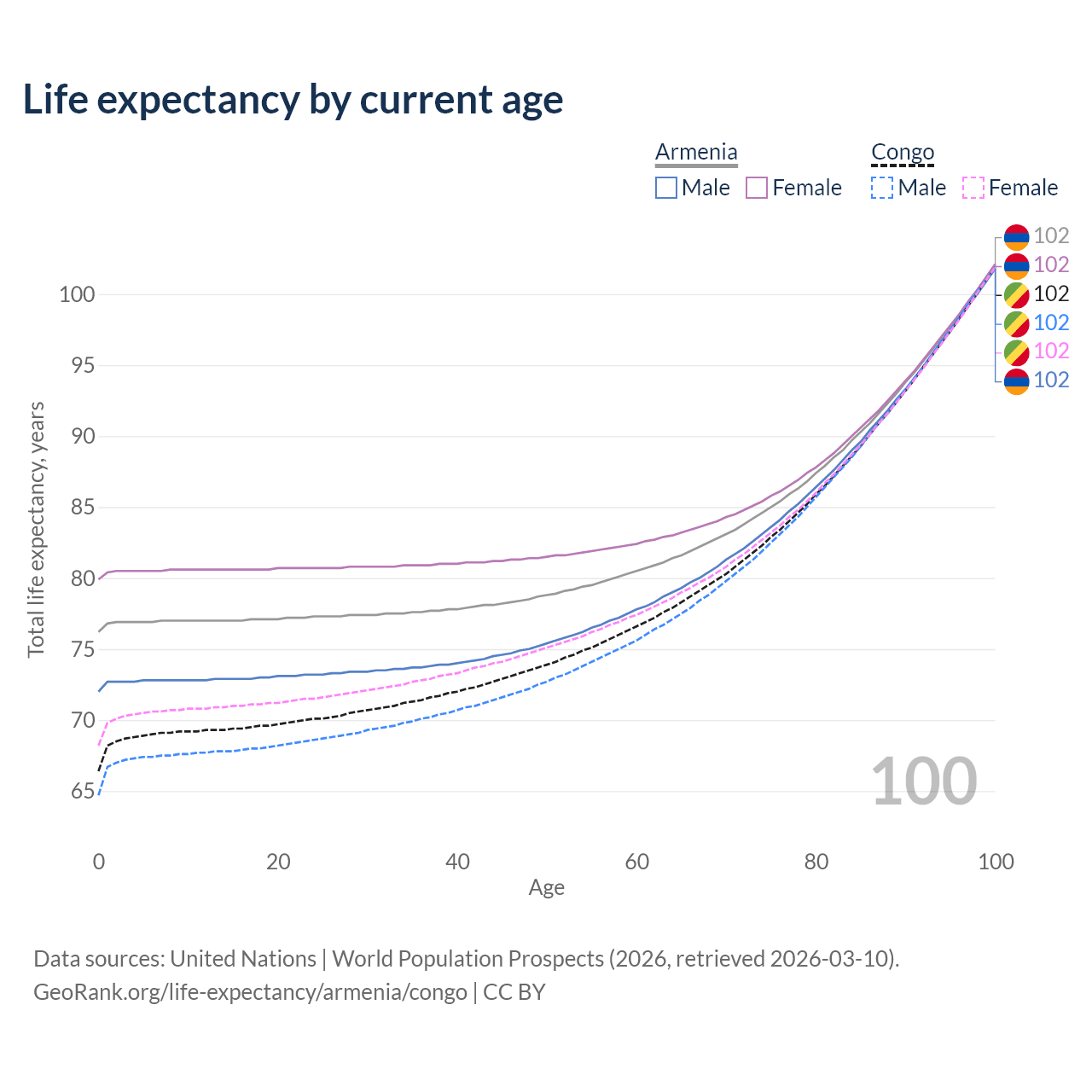 This life expectancy calculator shows the odds of living to 100, 95, 90, and below based on current age for both males and females in Armenia and the Congo, along with mean and median age of death. The calculations are based on the 2026 life tables (actuarial tables) from the UN World Population Prospects.