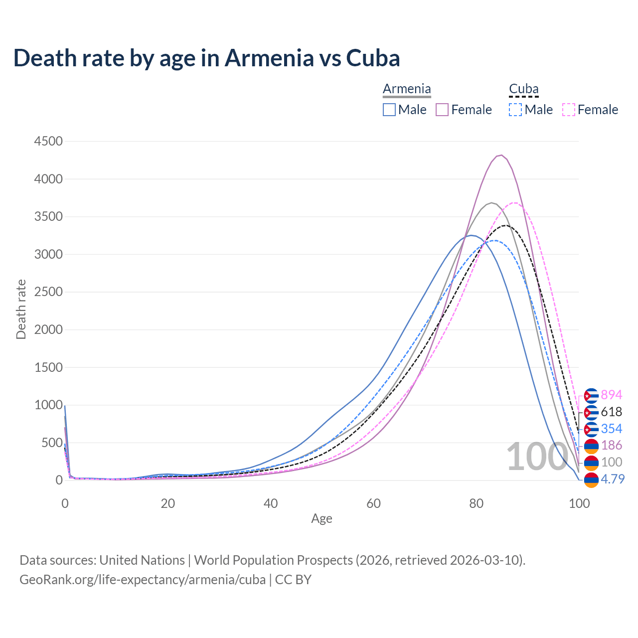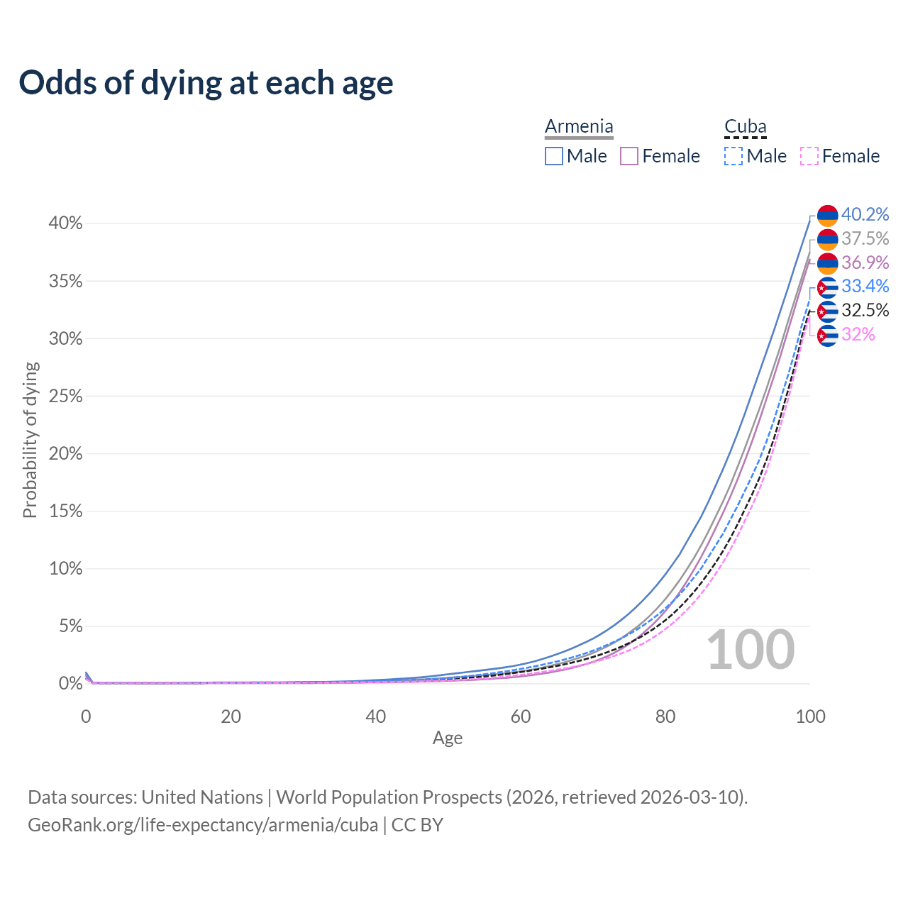 This life expectancy calculator shows the odds of living to 100, 95, 90, and below based on current age for both males and females in Armenia and Cuba, along with mean and median age of death. The calculations are based on the 2026 life tables (actuarial tables) from the UN World Population Prospects.