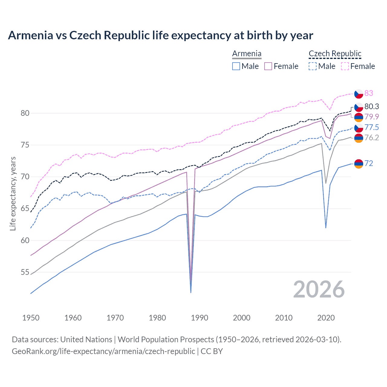 The average life expectancy at birth is 76.2 years in Armenia vs 80.3 in the Czech Republic. Armenia is ranked 83/197 by life expectancy, and the Czech Republic is 44/197. In Armenia, the life expectancy is 72 years for males and 79.9 years for females. In the Czech Republic, it's 77.5 years for males and 83 years for females.