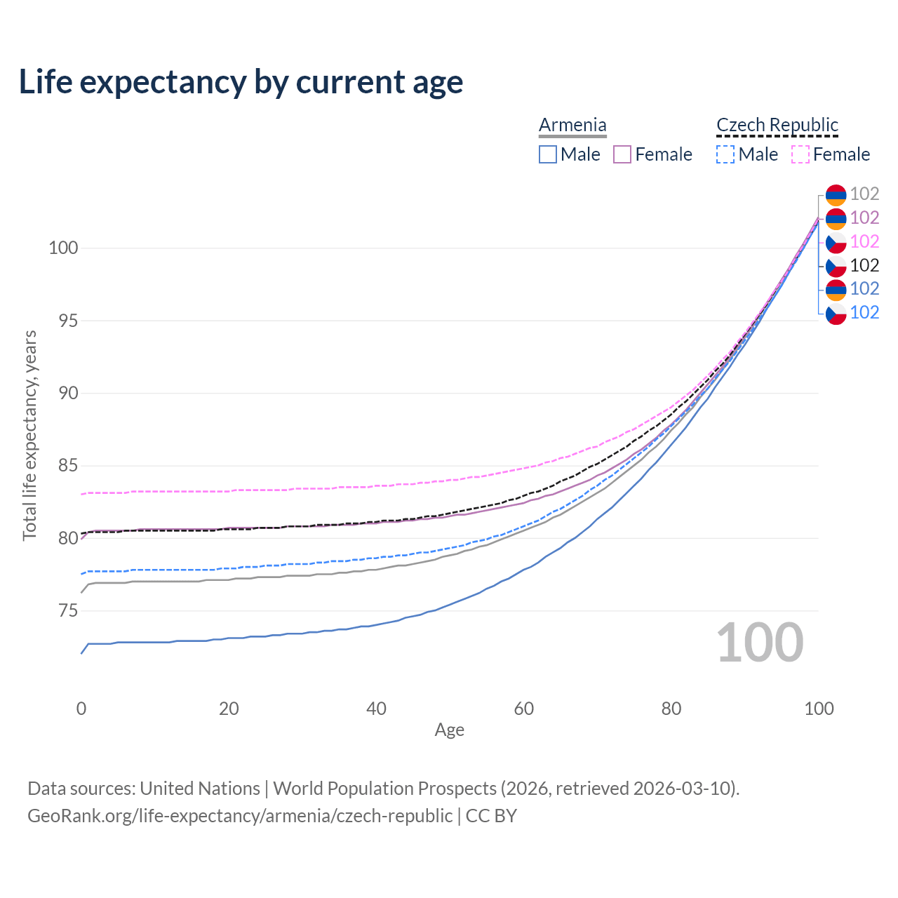 This life expectancy calculator shows the odds of living to 100, 95, 90, and below based on current age for both males and females in Armenia and the Czech Republic, along with mean and median age of death. The calculations are based on the 2026 life tables (actuarial tables) from the UN World Population Prospects.