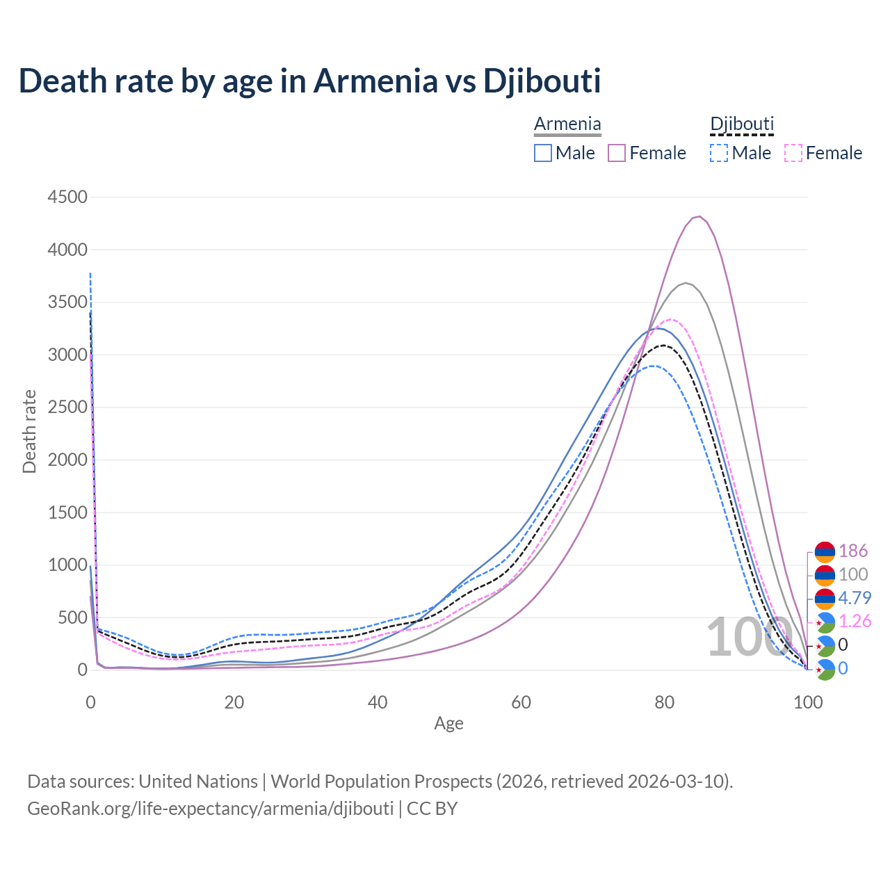 In Armenia, the most common age of death is 83, compared to 0 in Djibouti. The median age of death is 79.4 in Armenia and 73.7 in Djibouti, meaning only half of each cohort is expected to live past that age.