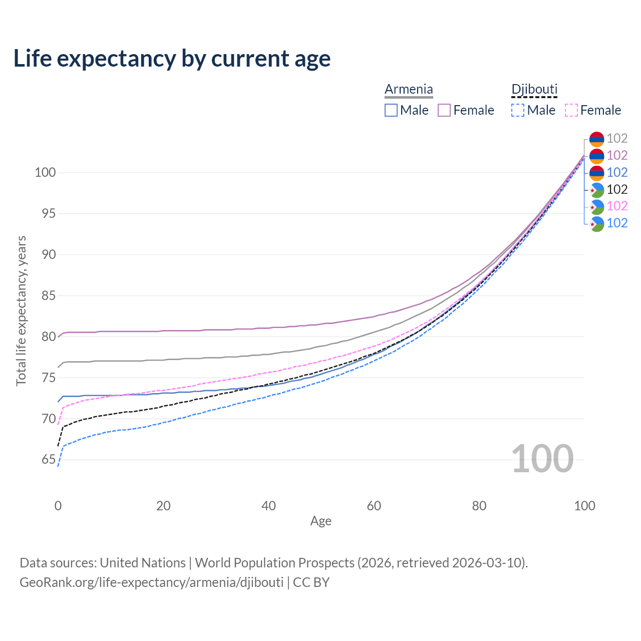 This life expectancy calculator shows the odds of living to 100, 95, 90, and below based on current age for both males and females in Armenia and Djibouti, along with mean and median age of death. The calculations are based on the 2026 life tables (actuarial tables) from the UN World Population Prospects.