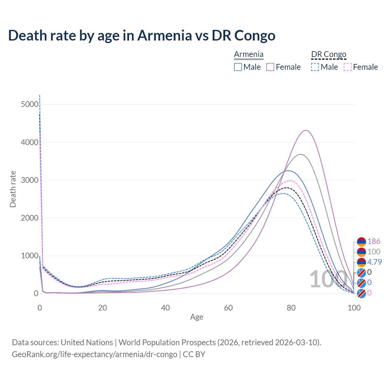In Armenia, the most common age of death is 83, compared to 0 in the DR Congo. The median age of death is 79.4 in Armenia and 70.9 in the DR Congo, meaning only half of each cohort is expected to live past that age.