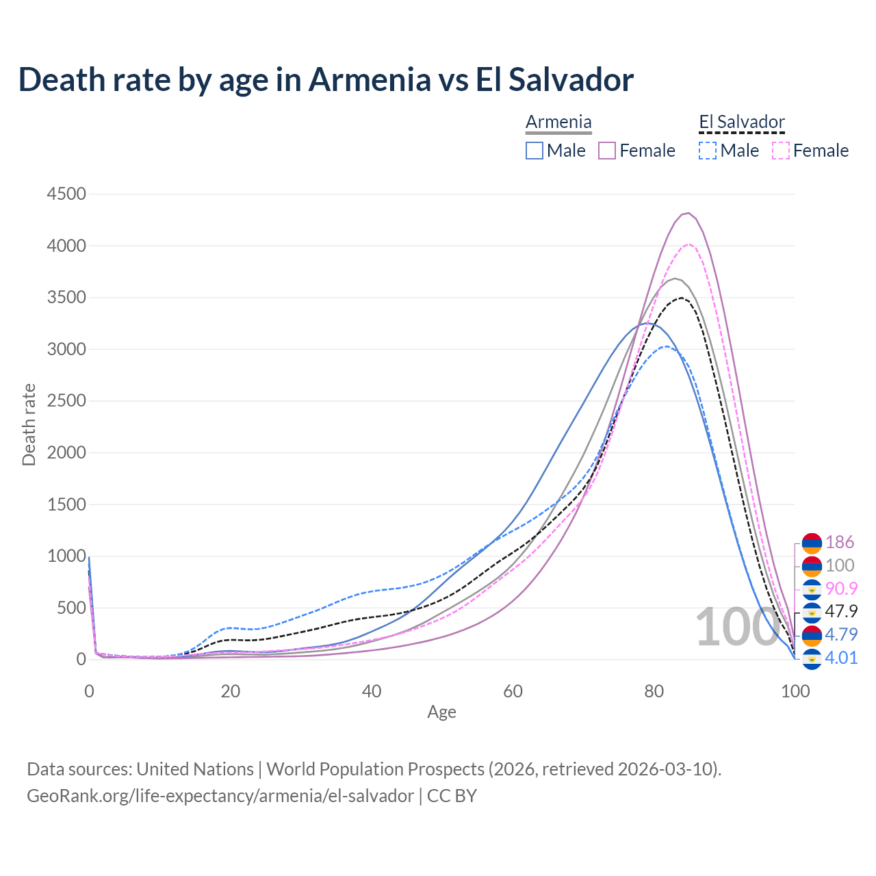 In Armenia, the most common age of death is 83, compared to 84 in El Salvador. The median age of death is 79.4 in Armenia and 78.1 in El Salvador, meaning only half of each cohort is expected to live past that age.