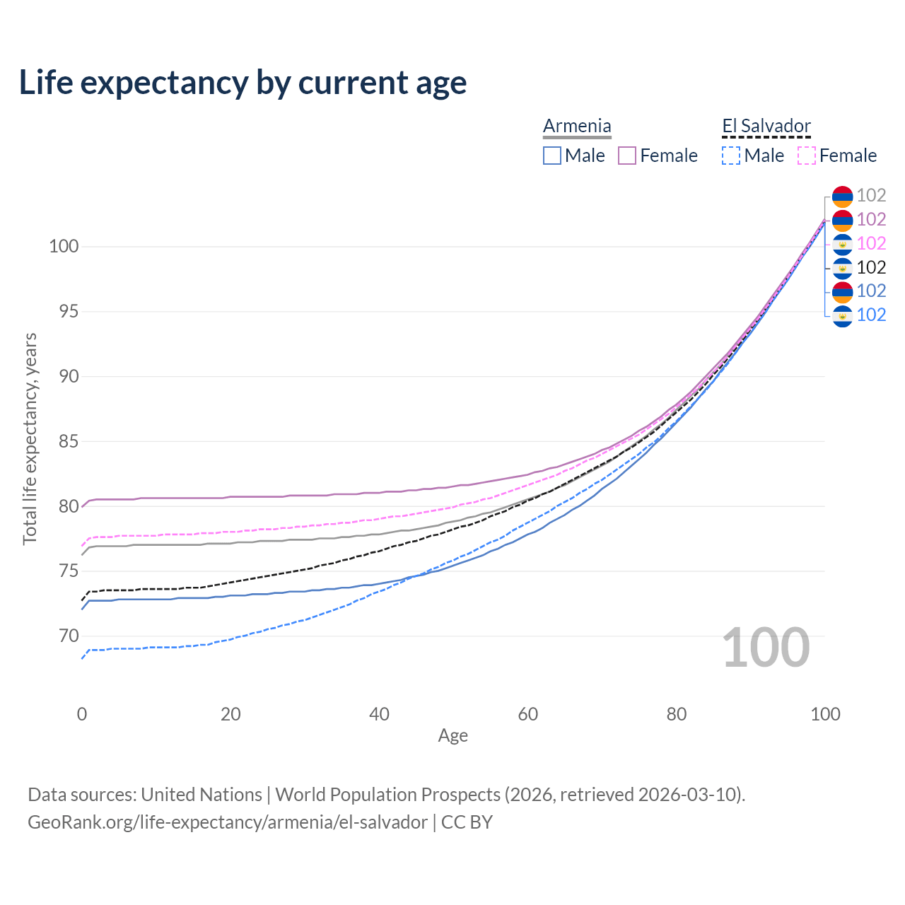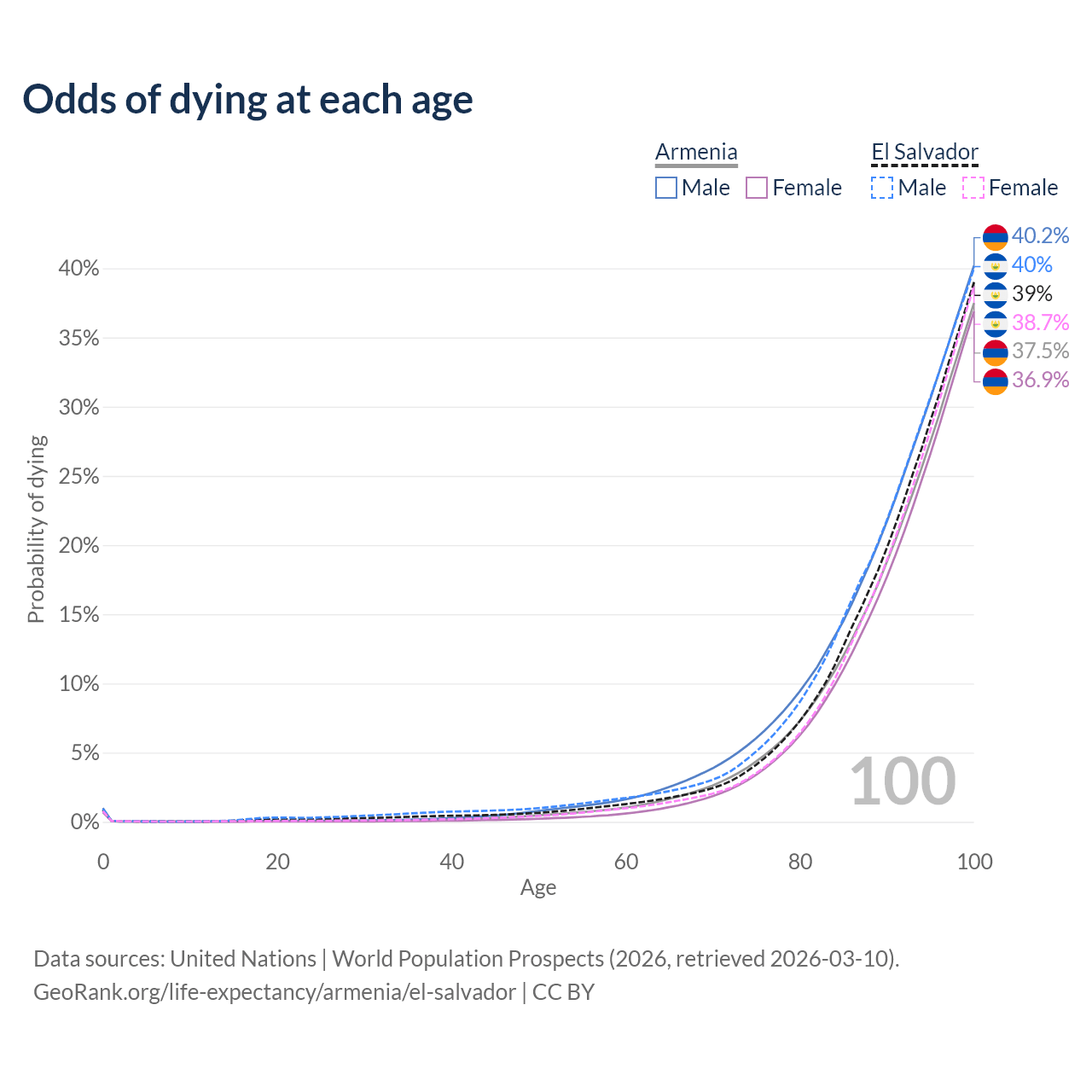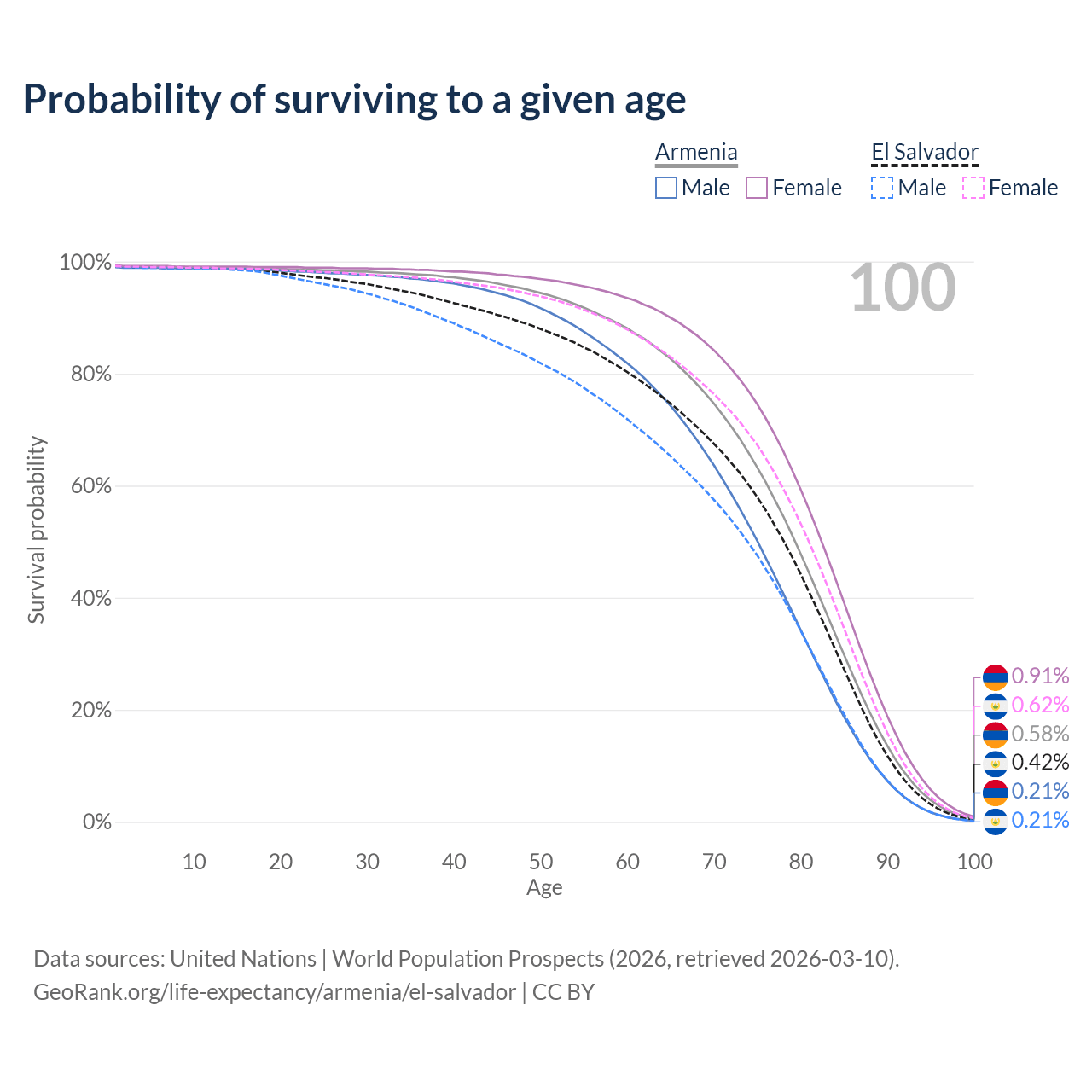This life expectancy calculator shows the odds of living to 100, 95, 90, and below based on current age for both males and females in Armenia and El Salvador, along with mean and median age of death. The calculations are based on the 2026 life tables (actuarial tables) from the UN World Population Prospects.