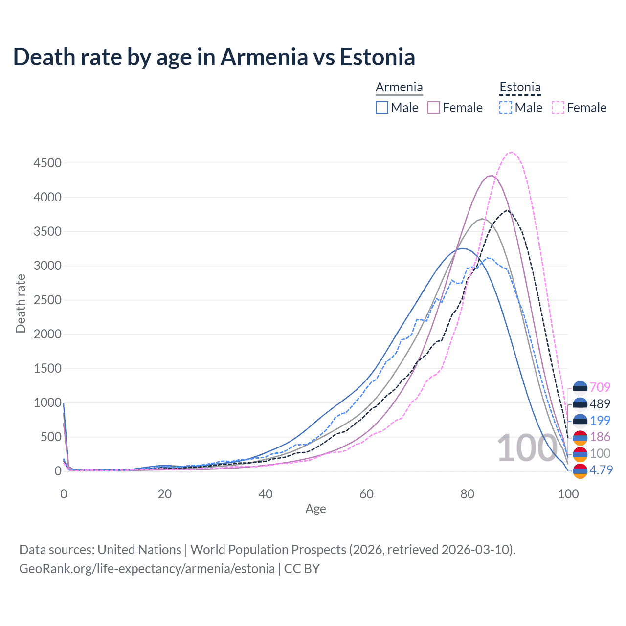 In Armenia, the most common age of death is 83, compared to 88 in Estonia. The median age of death is 79.4 in Armenia and 83.1 in Estonia, meaning only half of each cohort is expected to live past that age.