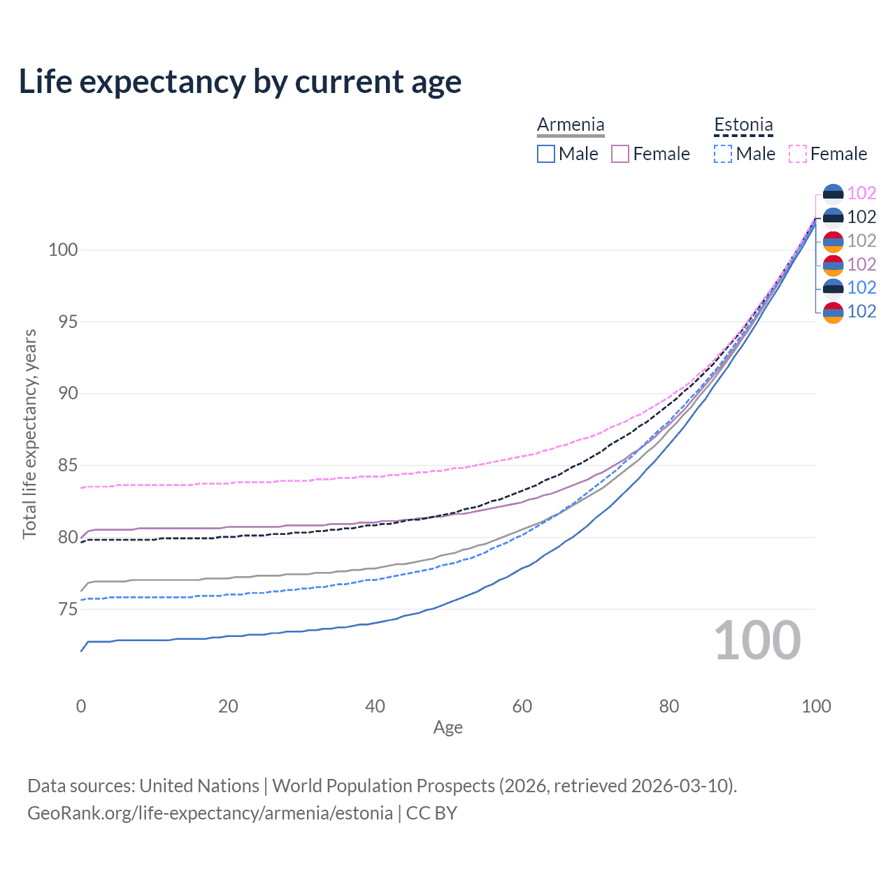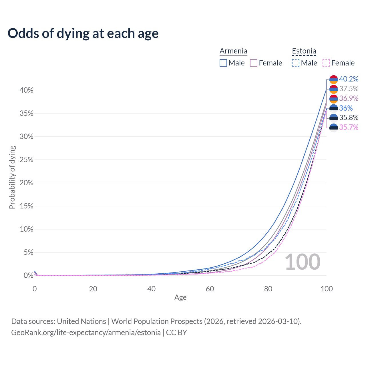 This life expectancy calculator shows the odds of living to 100, 95, 90, and below based on current age for both males and females in Armenia and Estonia, along with mean and median age of death. The calculations are based on the 2026 life tables (actuarial tables) from the UN World Population Prospects.