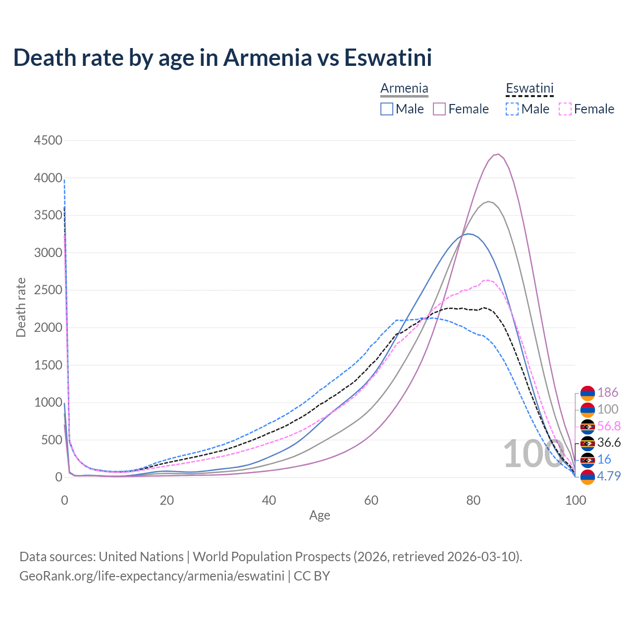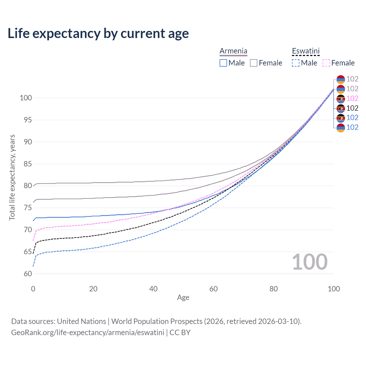 This life expectancy calculator shows the odds of living to 100, 95, 90, and below based on current age for both males and females in Armenia and Eswatini, along with mean and median age of death. The calculations are based on the 2026 life tables (actuarial tables) from the UN World Population Prospects.