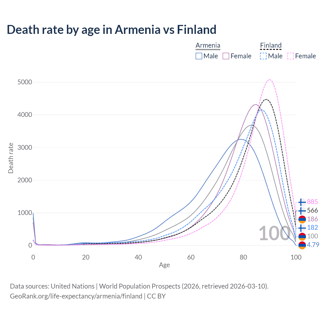 In Armenia, the most common age of death is 83, compared to 89 in Finland. The median age of death is 79.4 in Armenia and 85.6 in Finland, meaning only half of each cohort is expected to live past that age.