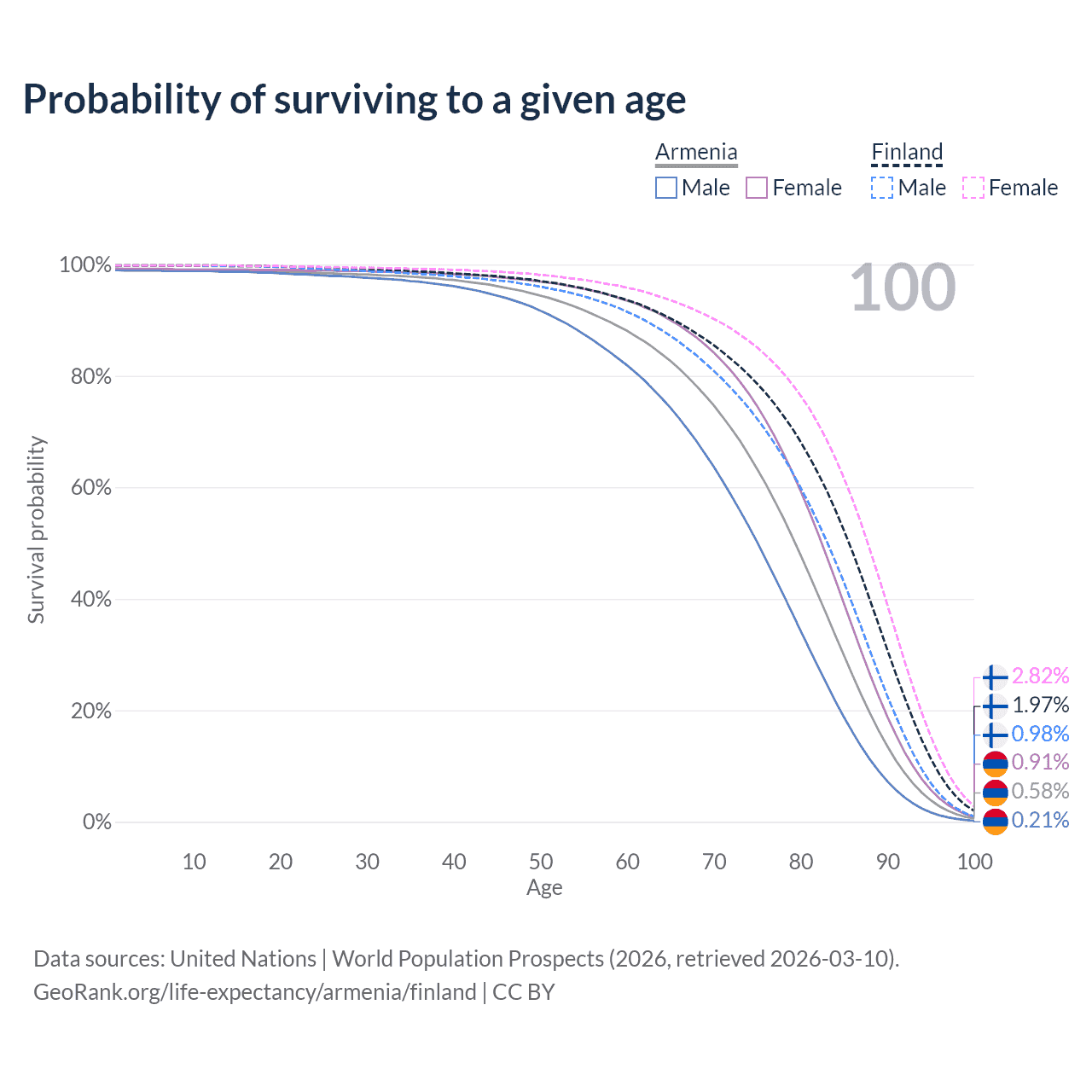 This life expectancy calculator shows the odds of living to 100, 95, 90, and below based on current age for both males and females in Armenia and Finland, along with mean and median age of death. The calculations are based on the 2026 life tables (actuarial tables) from the UN World Population Prospects.