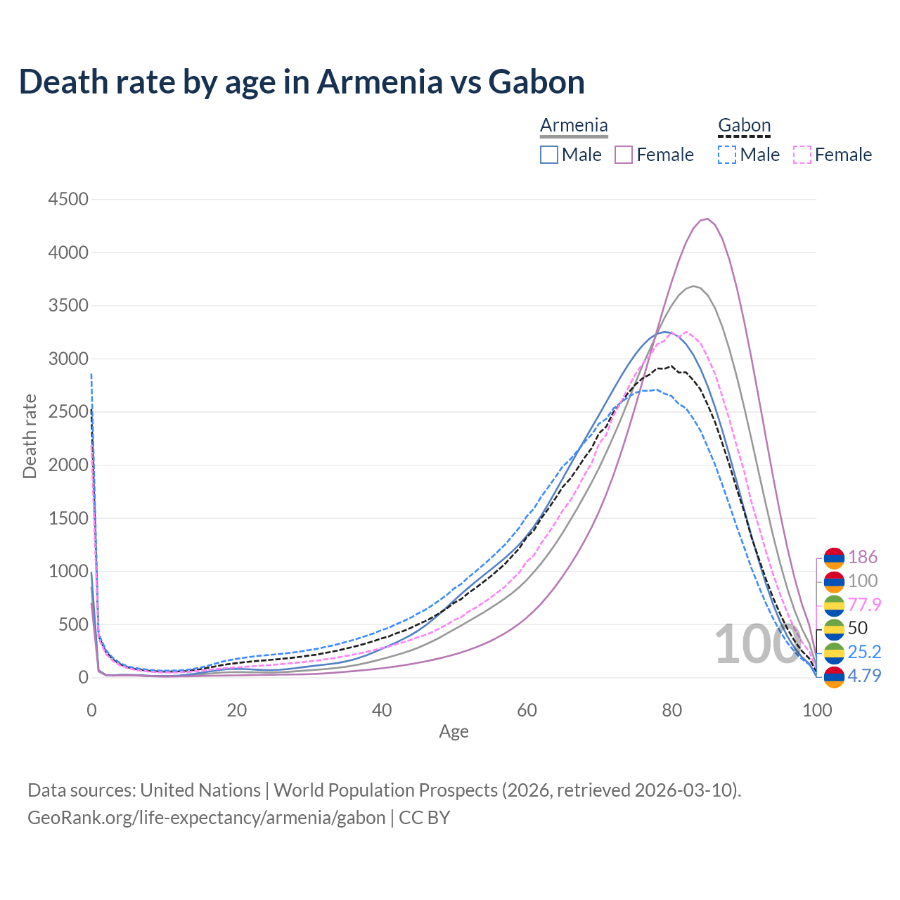 In Armenia, the most common age of death is 83, compared to 80 in Gabon. The median age of death is 79.4 in Armenia and 73.9 in Gabon, meaning only half of each cohort is expected to live past that age.