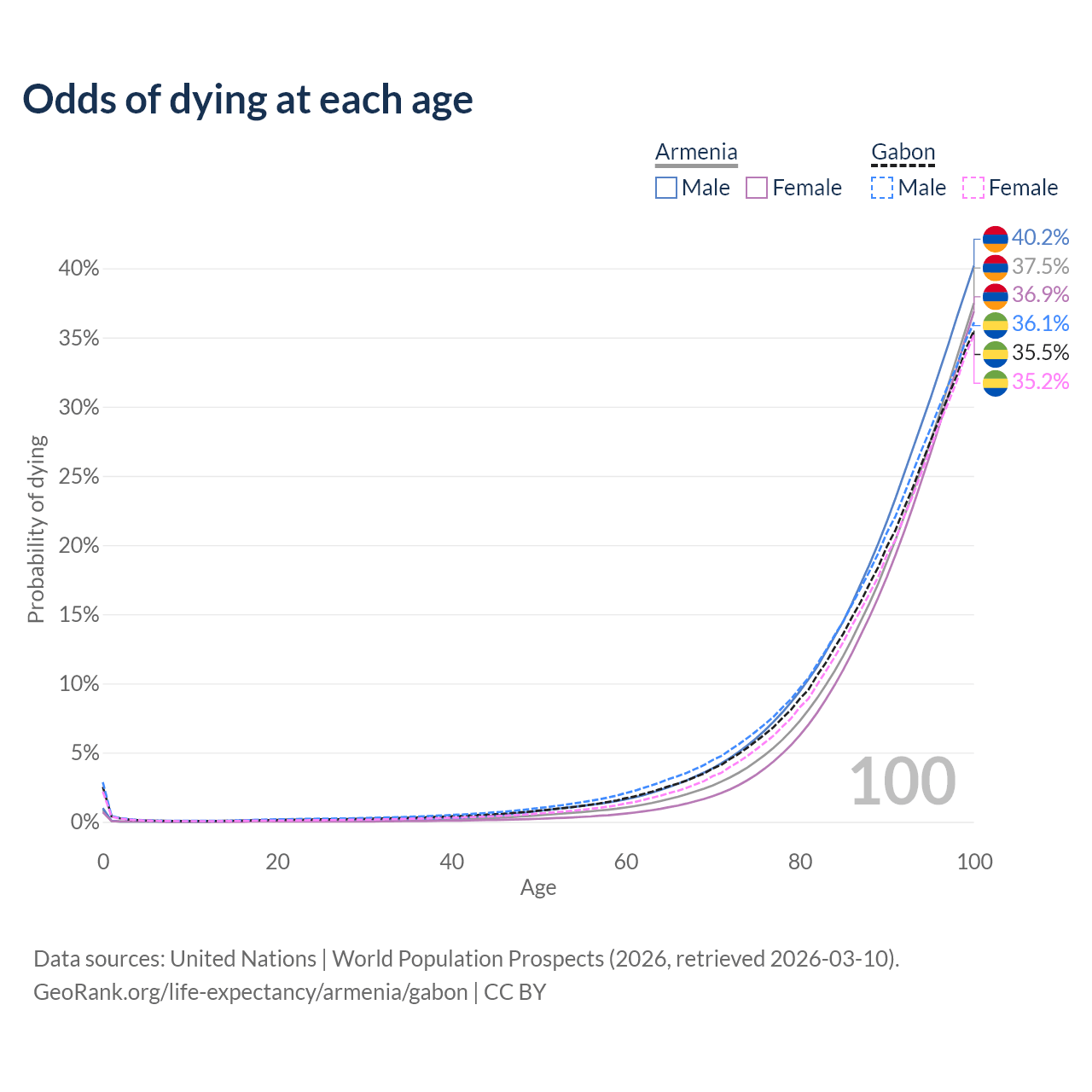 This life expectancy calculator shows the odds of living to 100, 95, 90, and below based on current age for both males and females in Armenia and Gabon, along with mean and median age of death. The calculations are based on the 2026 life tables (actuarial tables) from the UN World Population Prospects.