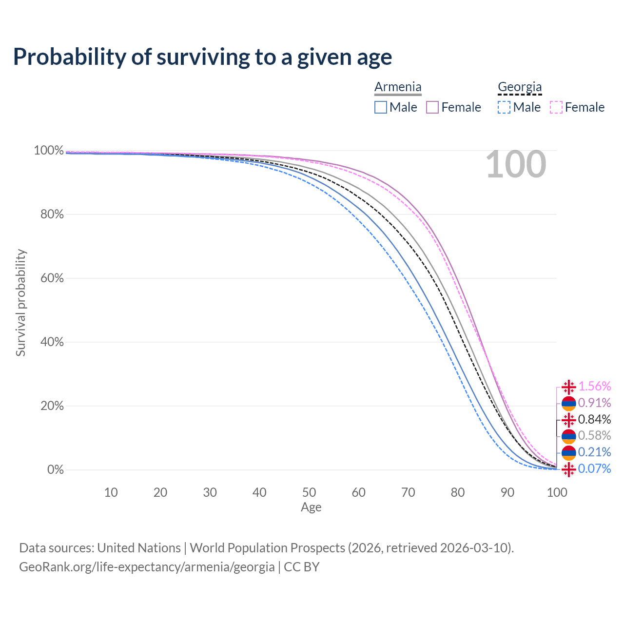 This life expectancy calculator shows the odds of living to 100, 95, 90, and below based on current age for both males and females in Armenia and Georgia, along with mean and median age of death. The calculations are based on the 2026 life tables (actuarial tables) from the UN World Population Prospects.