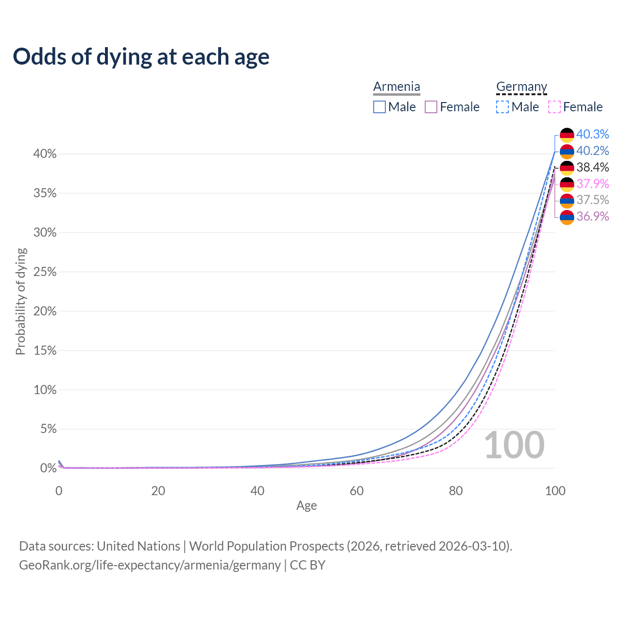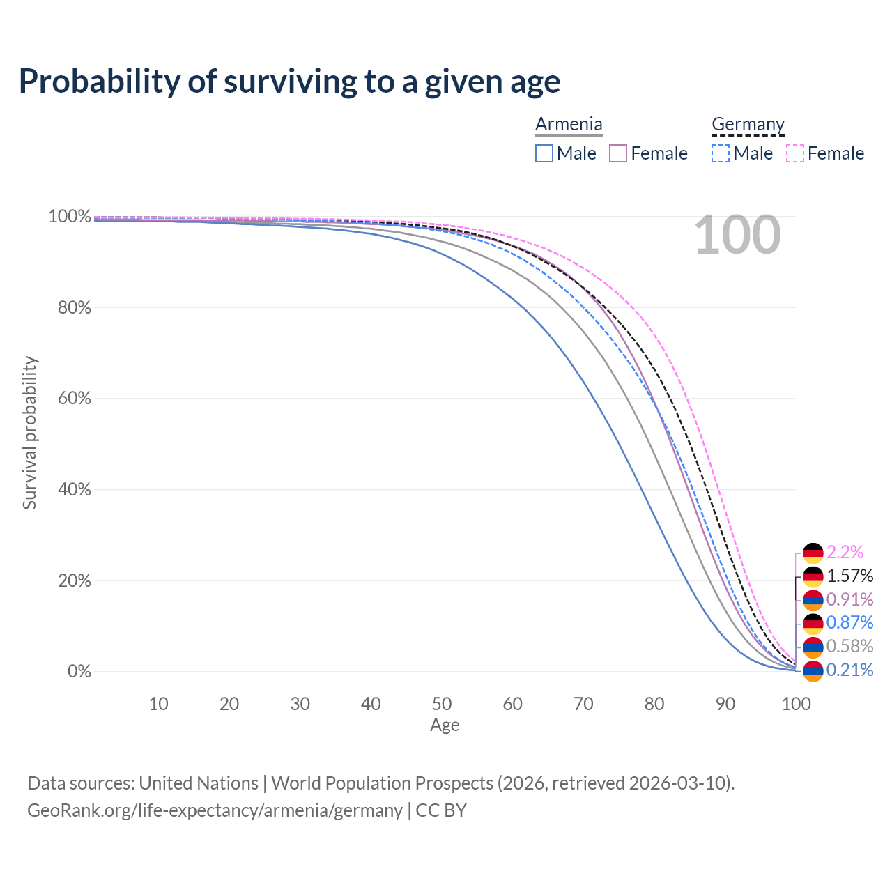 This life expectancy calculator shows the odds of living to 100, 95, 90, and below based on current age for both males and females in Armenia and Germany, along with mean and median age of death. The calculations are based on the 2026 life tables (actuarial tables) from the UN World Population Prospects.
