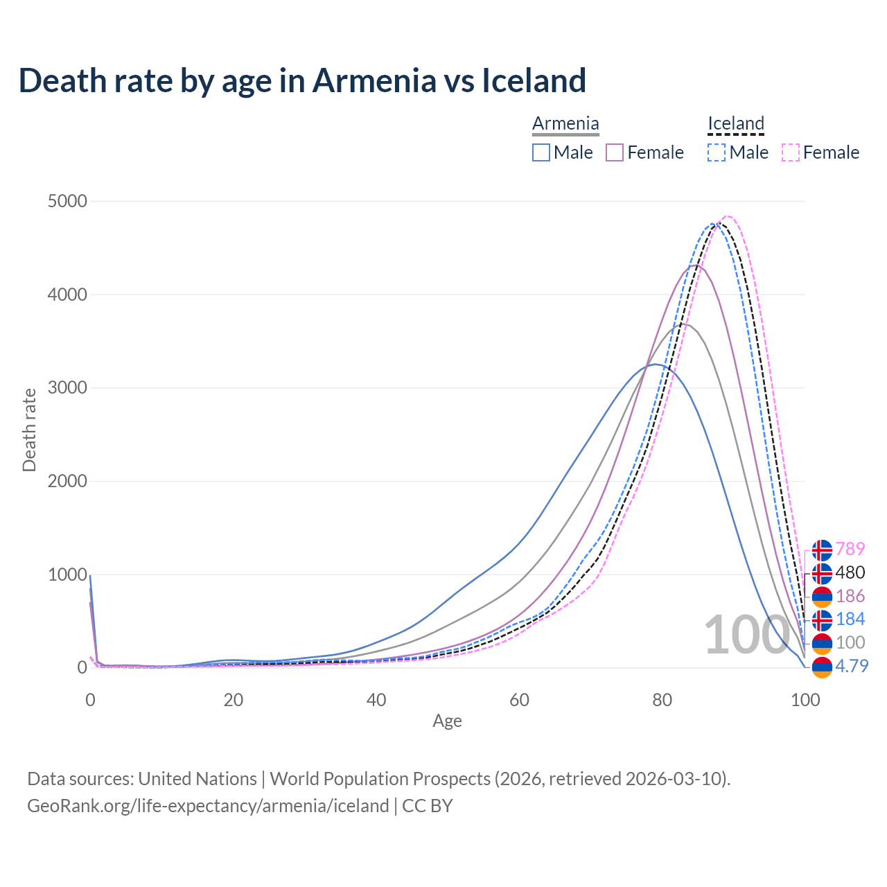 In Armenia, the most common age of death is 83, compared to 88 in Iceland. The median age of death is 79.4 in Armenia and 85.9 in Iceland, meaning only half of each cohort is expected to live past that age.