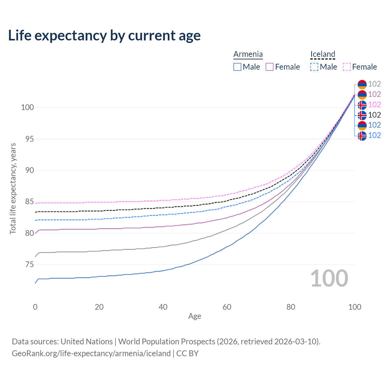 This life expectancy calculator shows the odds of living to 100, 95, 90, and below based on current age for both males and females in Armenia and Iceland, along with mean and median age of death. The calculations are based on the 2026 life tables (actuarial tables) from the UN World Population Prospects.