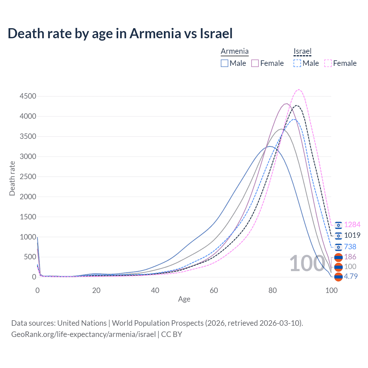 In Armenia, the most common age of death is 83, compared to 88 in Israel. The median age of death is 79.4 in Armenia and 85.6 in Israel, meaning only half of each cohort is expected to live past that age.