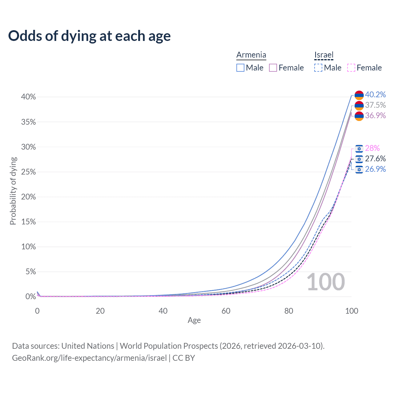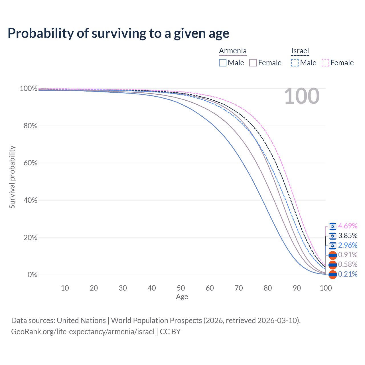 This life expectancy calculator shows the odds of living to 100, 95, 90, and below based on current age for both males and females in Armenia and Israel, along with mean and median age of death. The calculations are based on the 2026 life tables (actuarial tables) from the UN World Population Prospects.