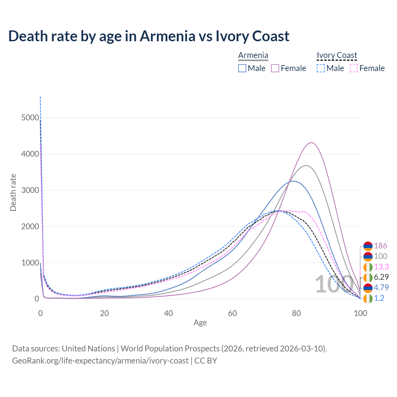 In Armenia, the most common age of death is 83, compared to 0 in Ivory Coast. The median age of death is 79.4 in Armenia and 68.6 in Ivory Coast, meaning only half of each cohort is expected to live past that age.