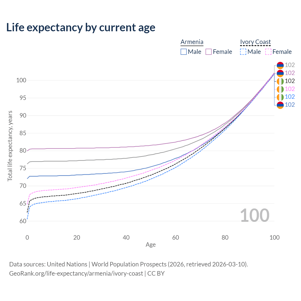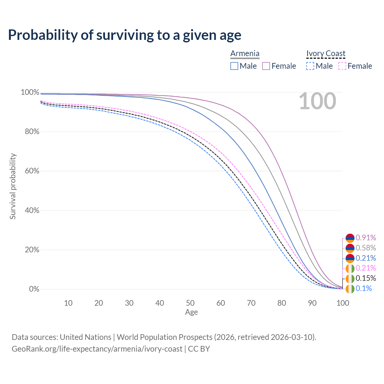 This life expectancy calculator shows the odds of living to 100, 95, 90, and below based on current age for both males and females in Armenia and Ivory Coast, along with mean and median age of death. The calculations are based on the 2026 life tables (actuarial tables) from the UN World Population Prospects.