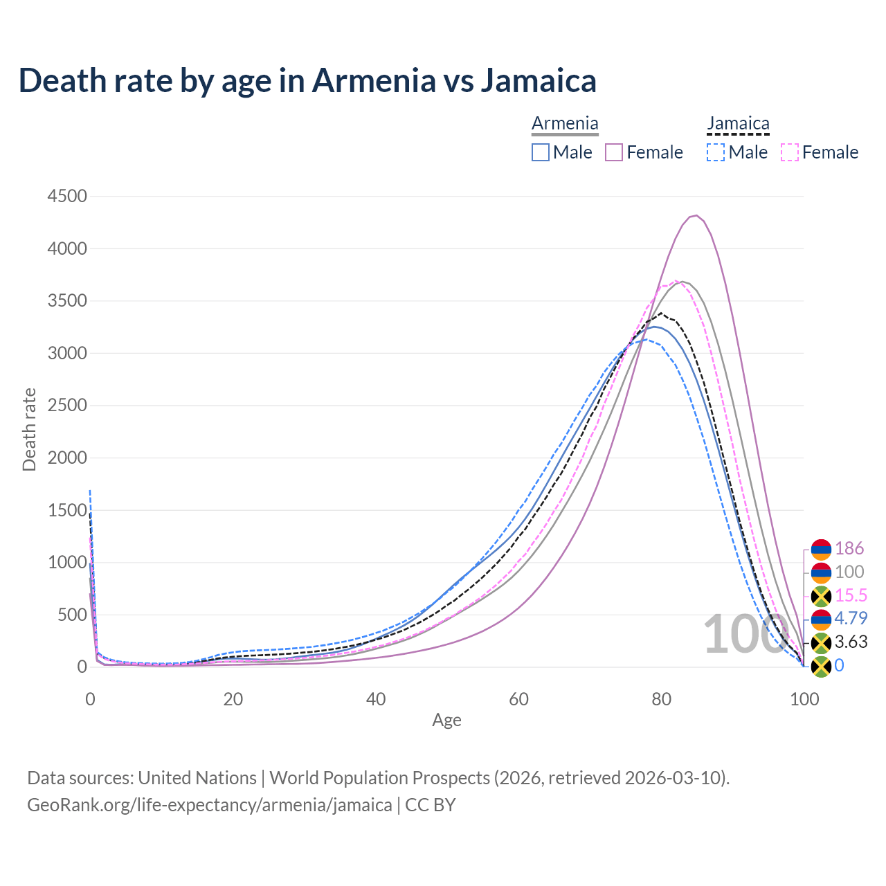 This life expectancy calculator shows the odds of living to 100, 95, 90, and below based on current age for both males and females in Armenia and Jamaica, along with mean and median age of death. The calculations are based on the 2026 life tables (actuarial tables) from the UN World Population Prospects.