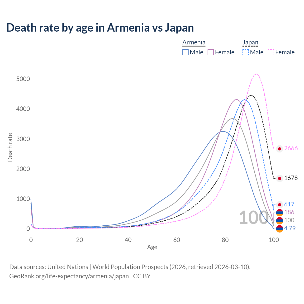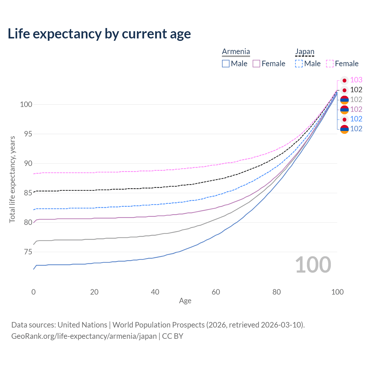 This life expectancy calculator shows the odds of living to 100, 95, 90, and below based on current age for both males and females in Armenia and Japan, along with mean and median age of death. The calculations are based on the 2026 life tables (actuarial tables) from the UN World Population Prospects.