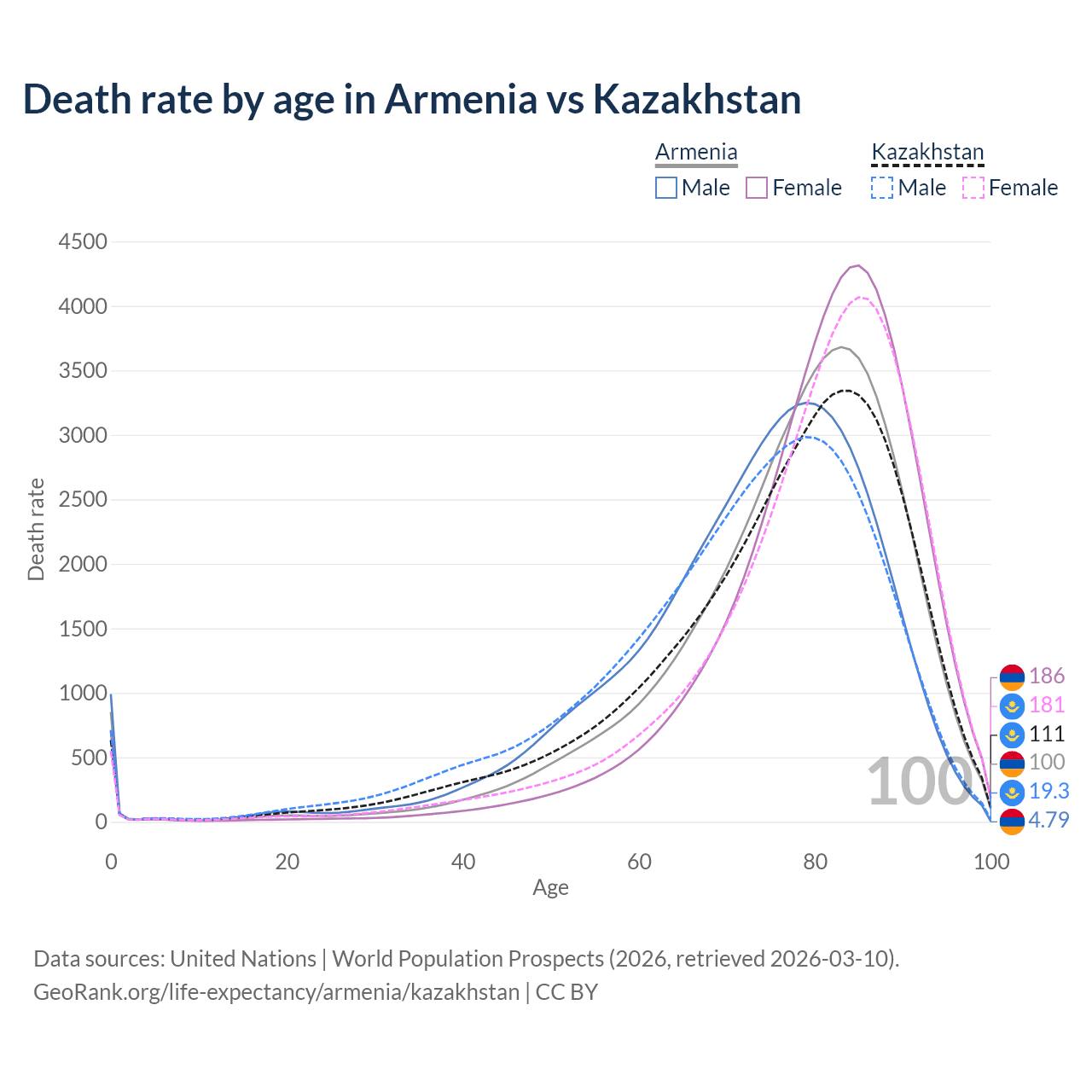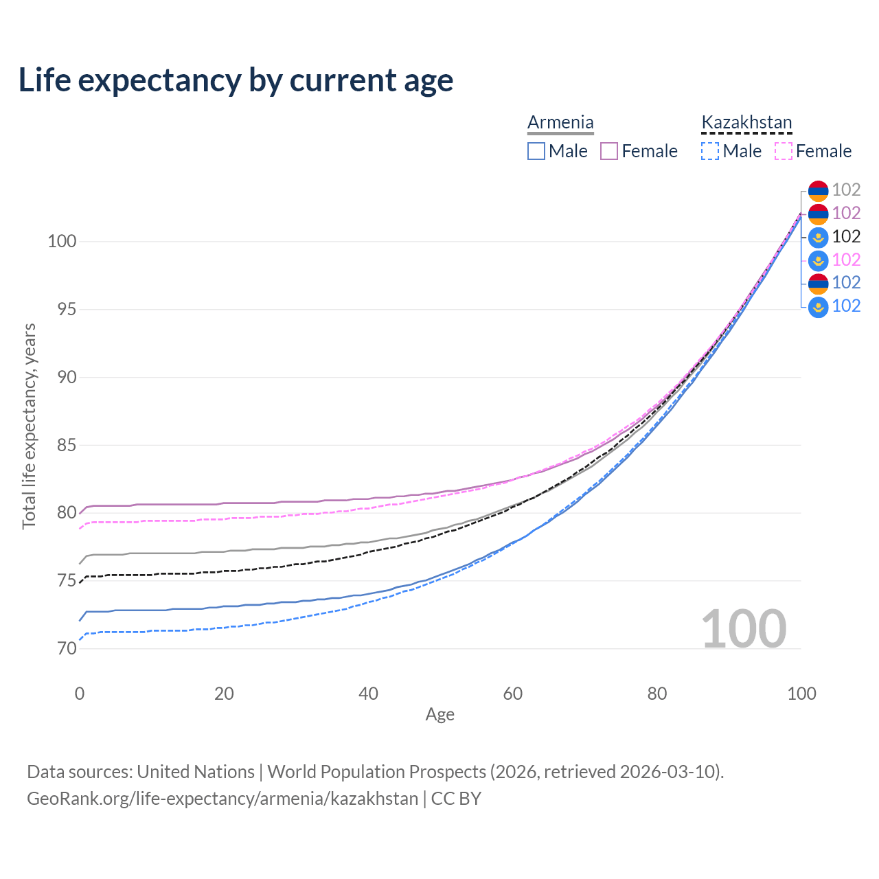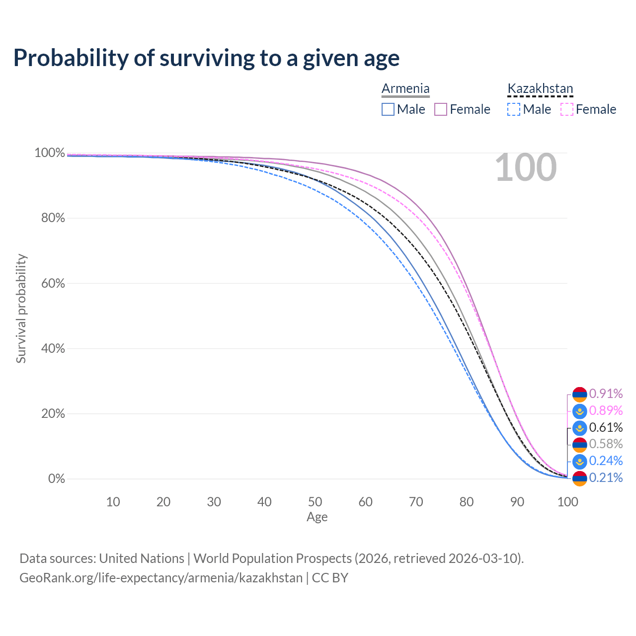 This life expectancy calculator shows the odds of living to 100, 95, 90, and below based on current age for both males and females in Armenia and Kazakhstan, along with mean and median age of death. The calculations are based on the 2026 life tables (actuarial tables) from the UN World Population Prospects.