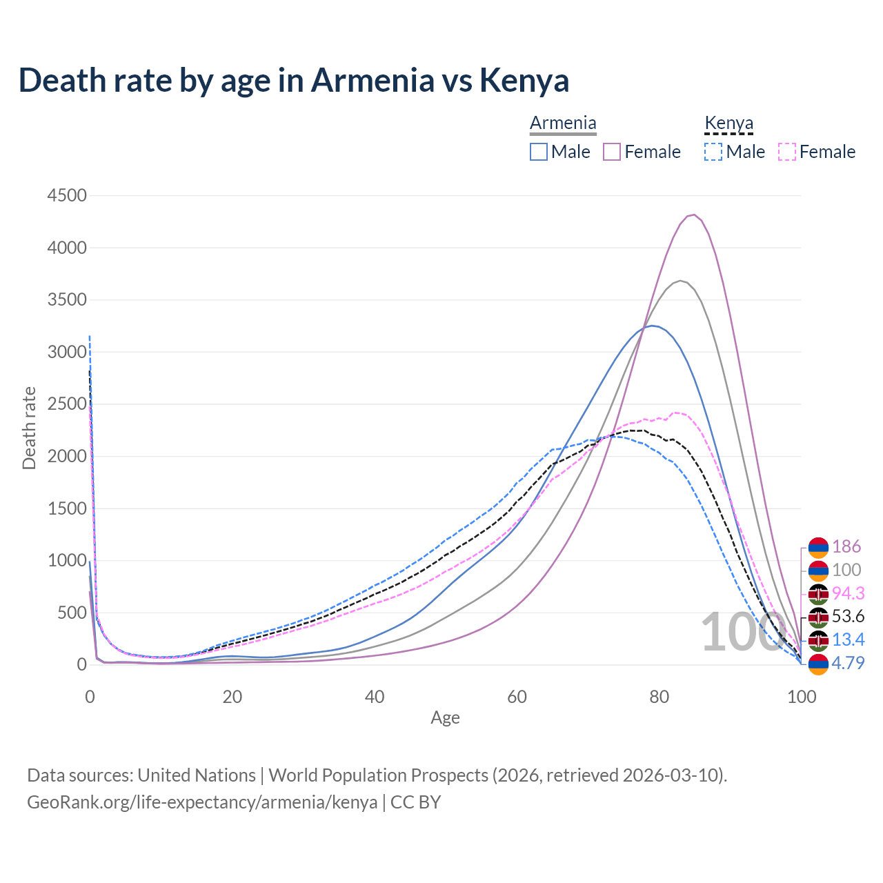 This life expectancy calculator shows the odds of living to 100, 95, 90, and below based on current age for both males and females in Armenia and Kenya, along with mean and median age of death. The calculations are based on the 2026 life tables (actuarial tables) from the UN World Population Prospects.