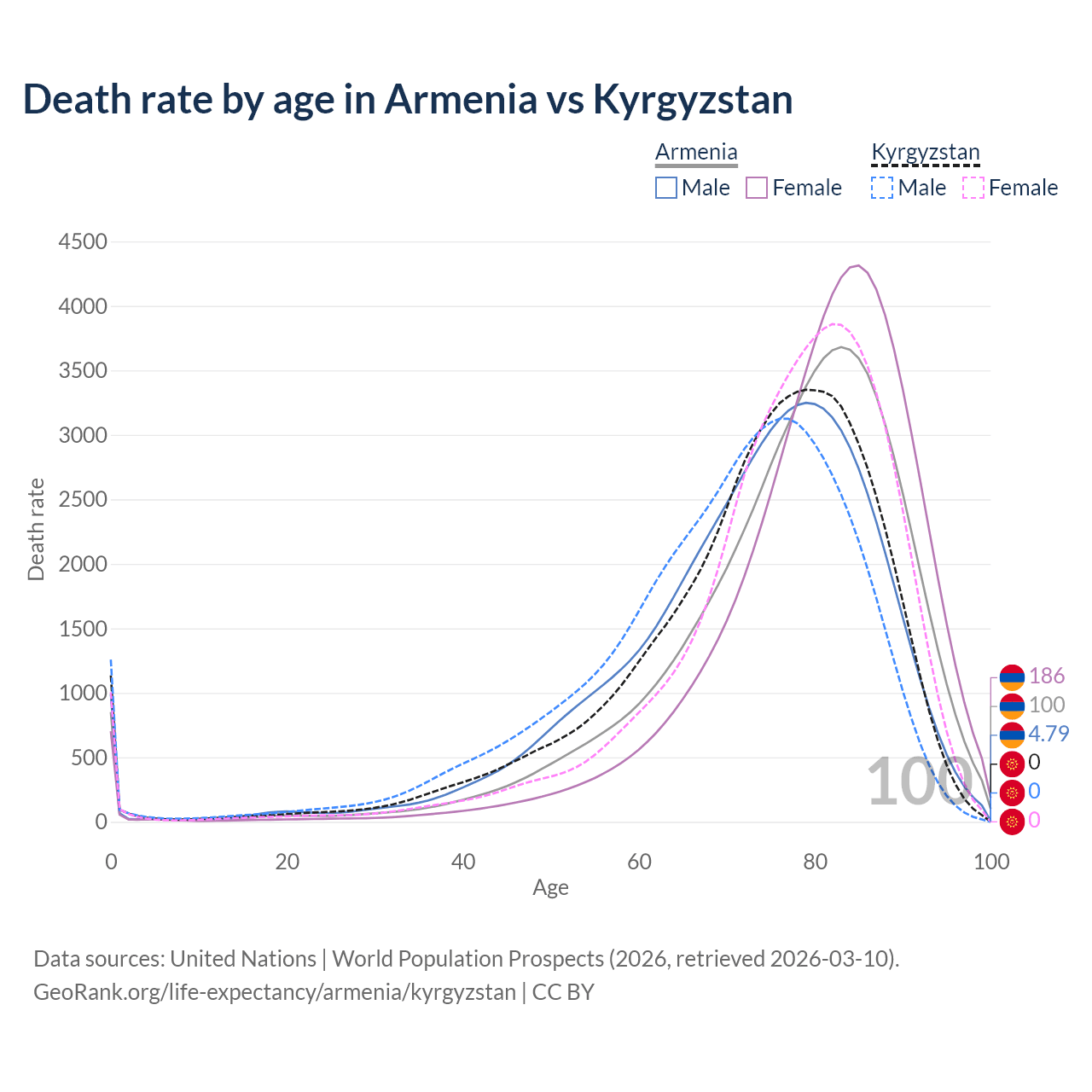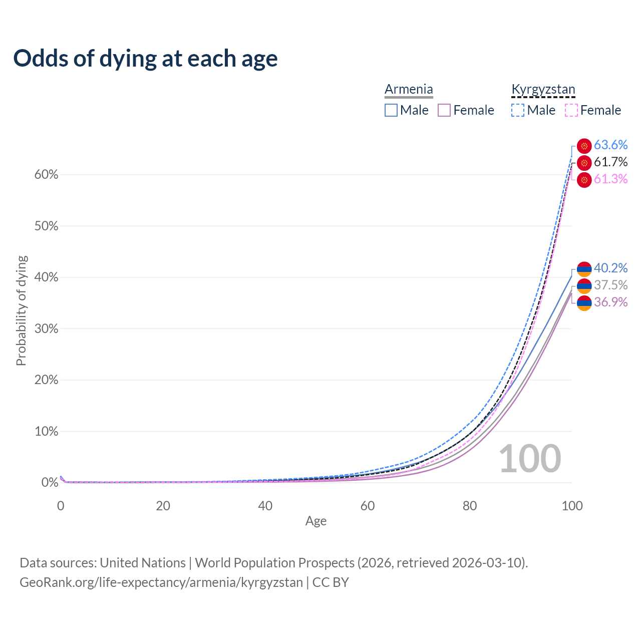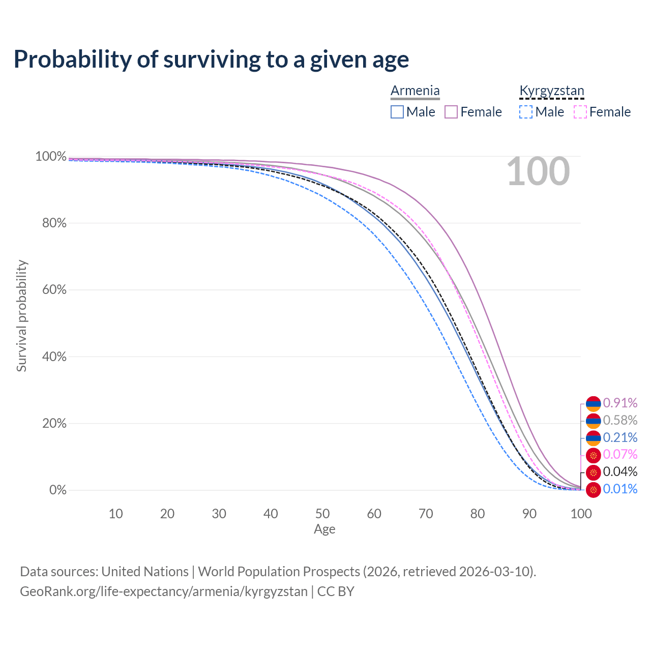 This life expectancy calculator shows the odds of living to 100, 95, 90, and below based on current age for both males and females in Armenia and Kyrgyzstan, along with mean and median age of death. The calculations are based on the 2026 life tables (actuarial tables) from the UN World Population Prospects.