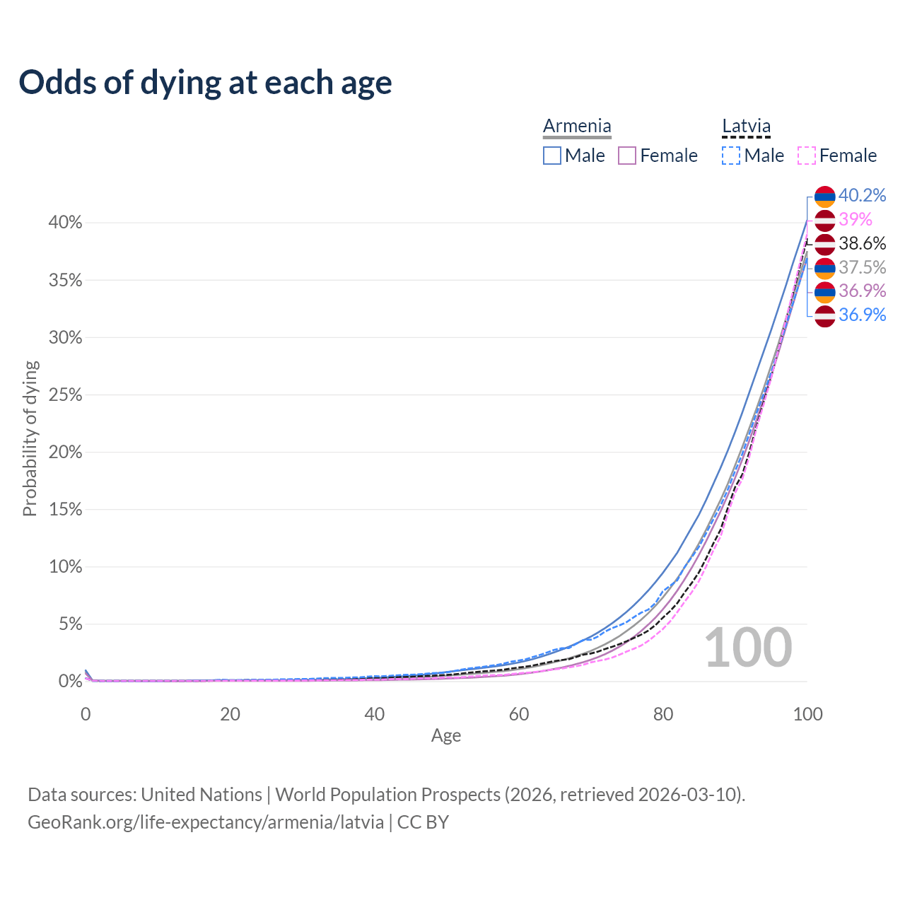 This life expectancy calculator shows the odds of living to 100, 95, 90, and below based on current age for both males and females in Armenia and Latvia, along with mean and median age of death. The calculations are based on the 2026 life tables (actuarial tables) from the UN World Population Prospects.
