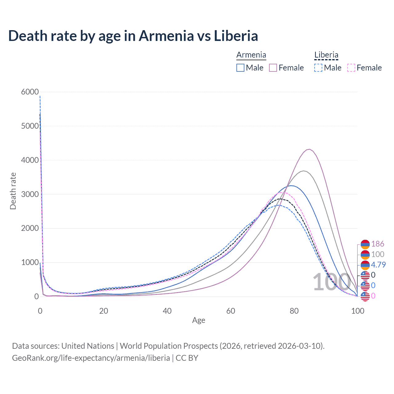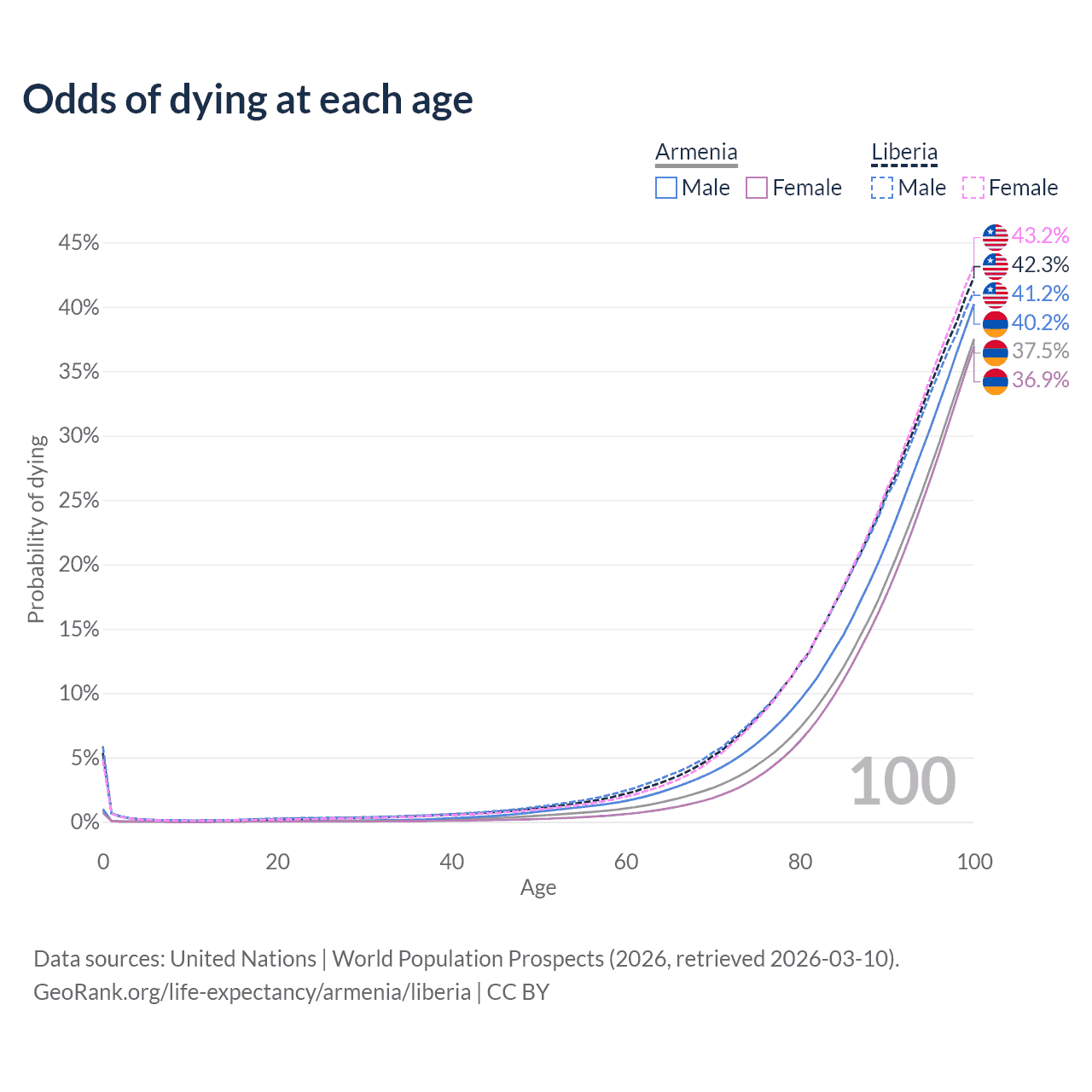 This life expectancy calculator shows the odds of living to 100, 95, 90, and below based on current age for both males and females in Armenia and Liberia, along with mean and median age of death. The calculations are based on the 2026 life tables (actuarial tables) from the UN World Population Prospects.