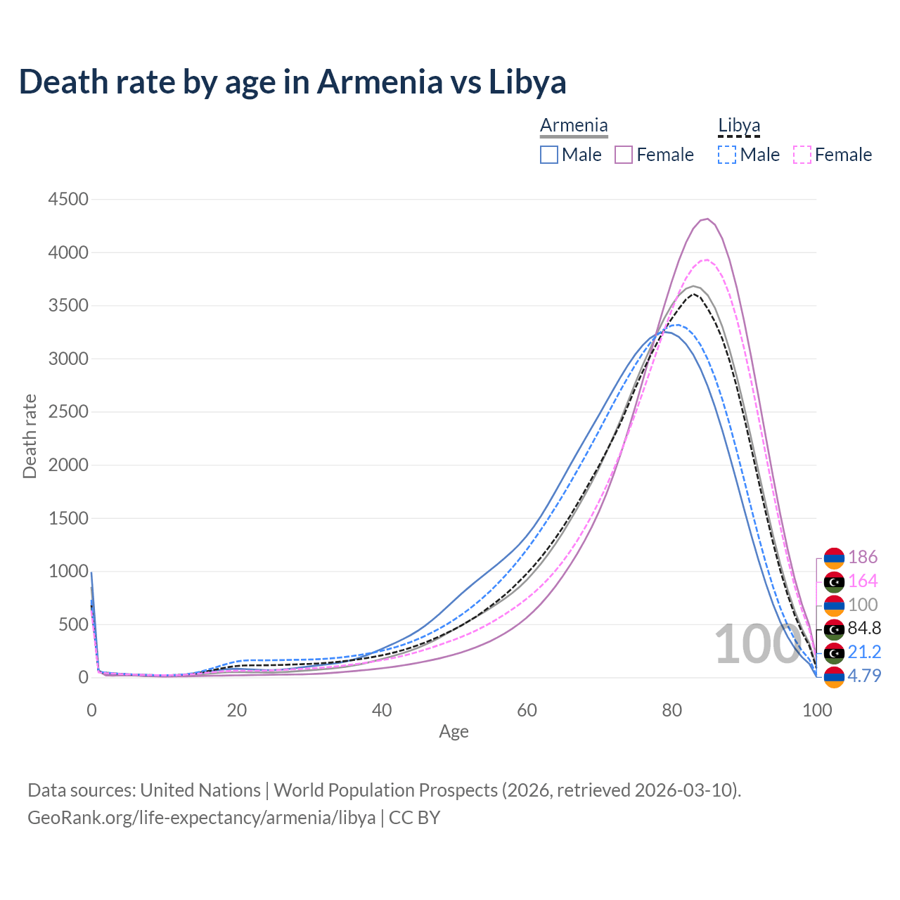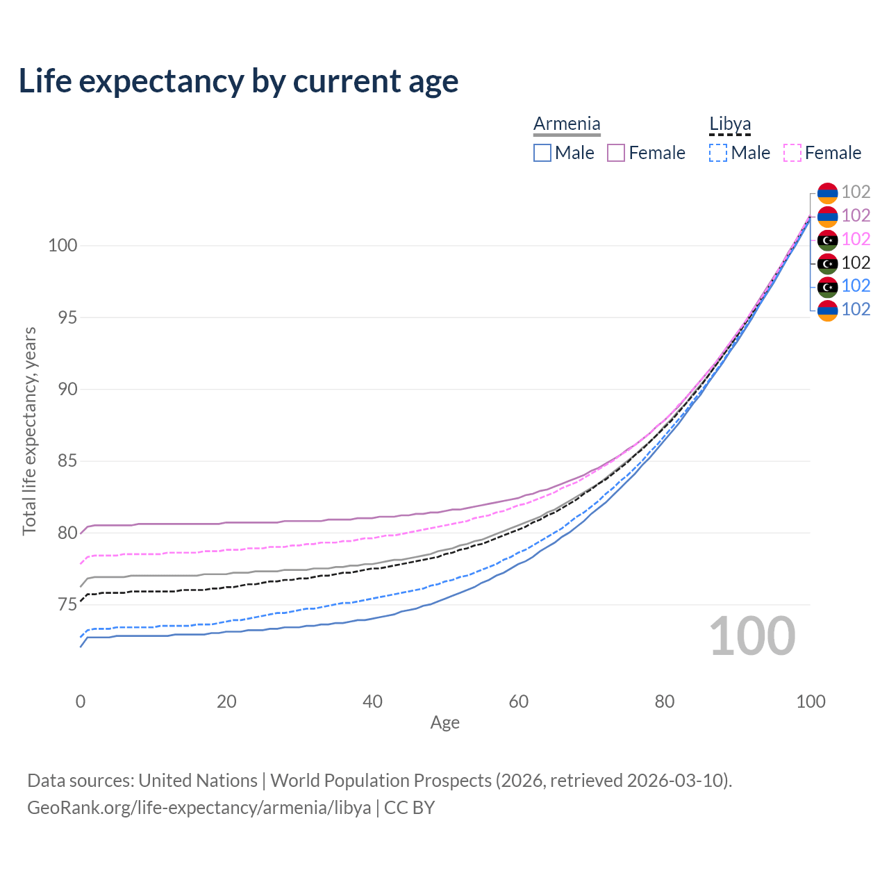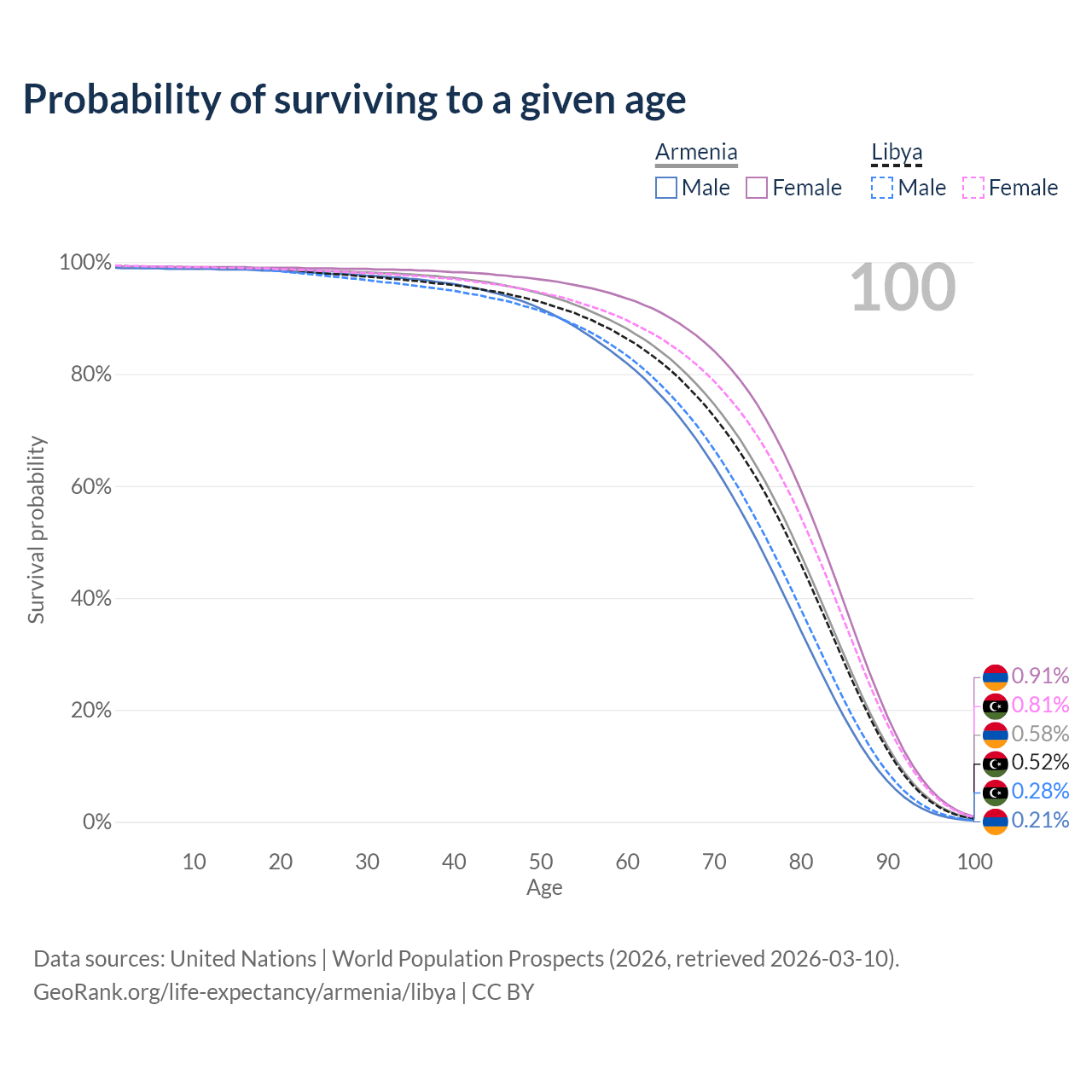 This life expectancy calculator shows the odds of living to 100, 95, 90, and below based on current age for both males and females in Armenia and Libya, along with mean and median age of death. The calculations are based on the 2026 life tables (actuarial tables) from the UN World Population Prospects.