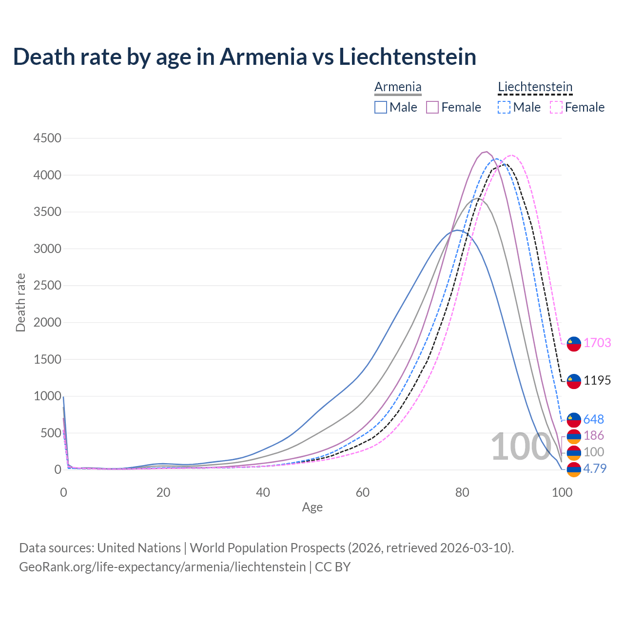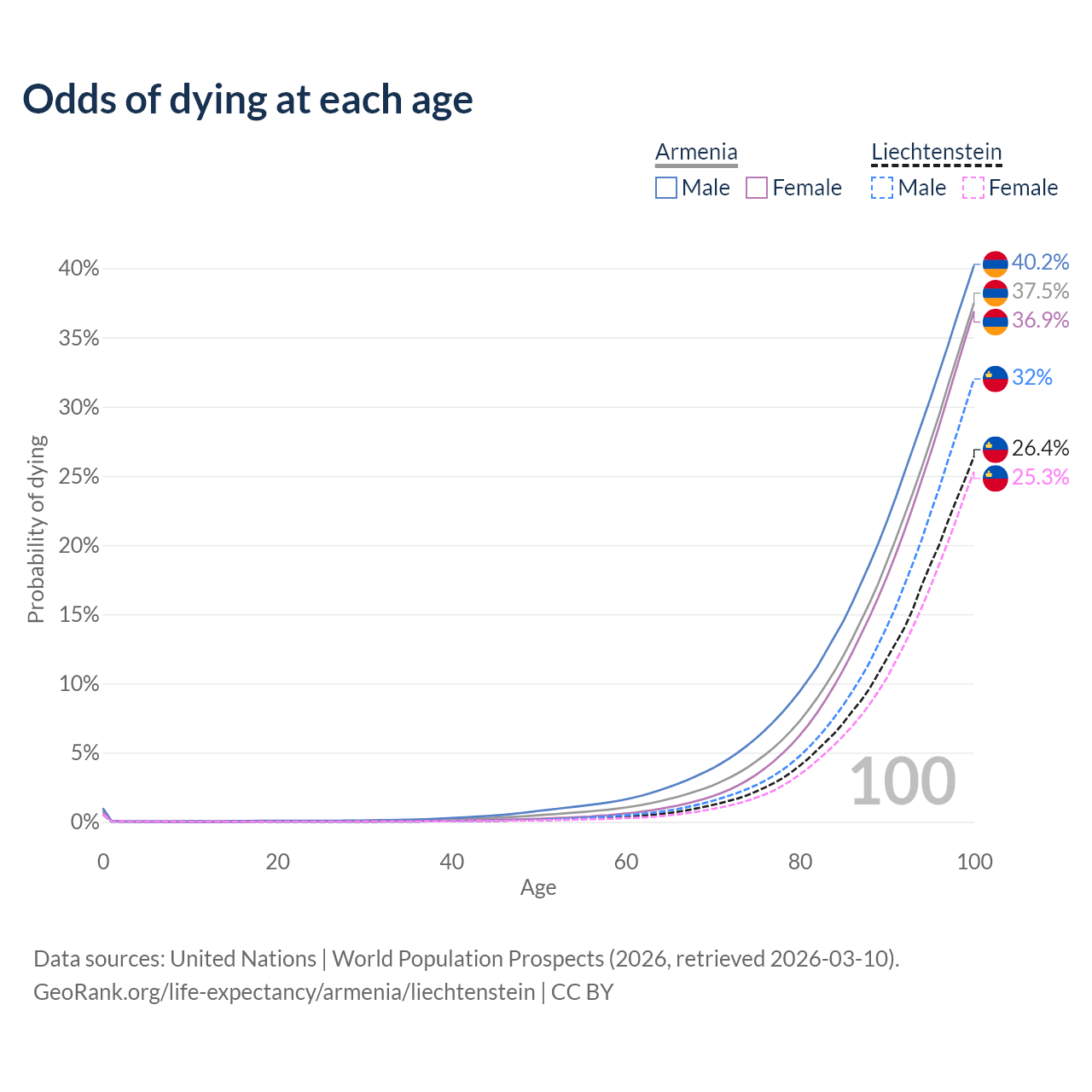 This life expectancy calculator shows the odds of living to 100, 95, 90, and below based on current age for both males and females in Armenia and Liechtenstein, along with mean and median age of death. The calculations are based on the 2026 life tables (actuarial tables) from the UN World Population Prospects.
