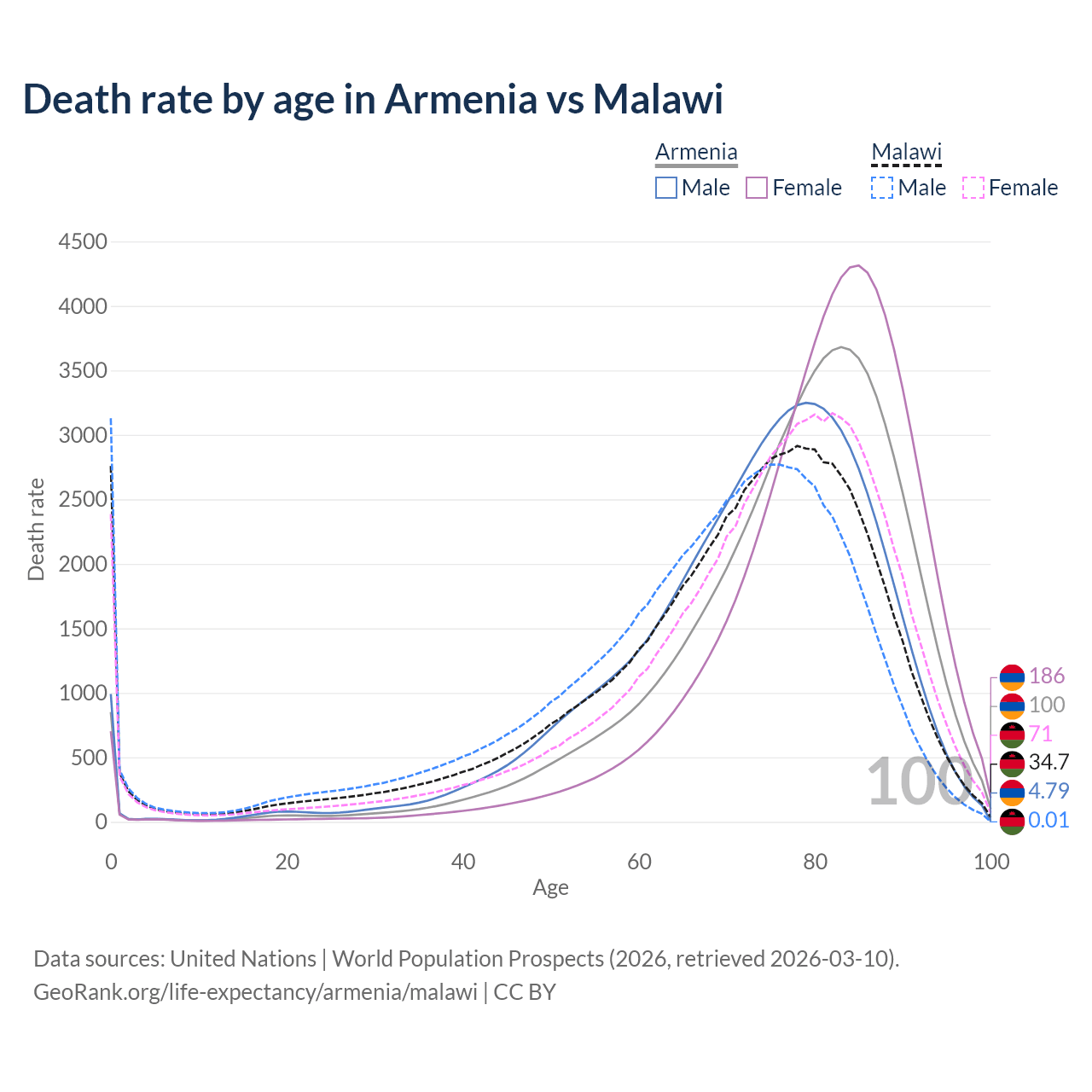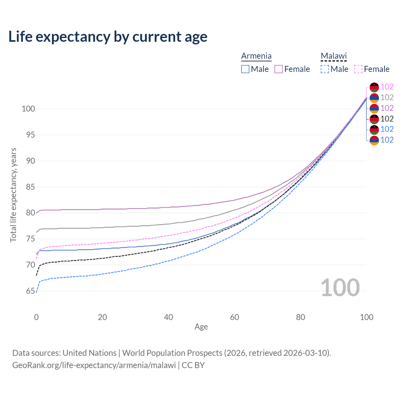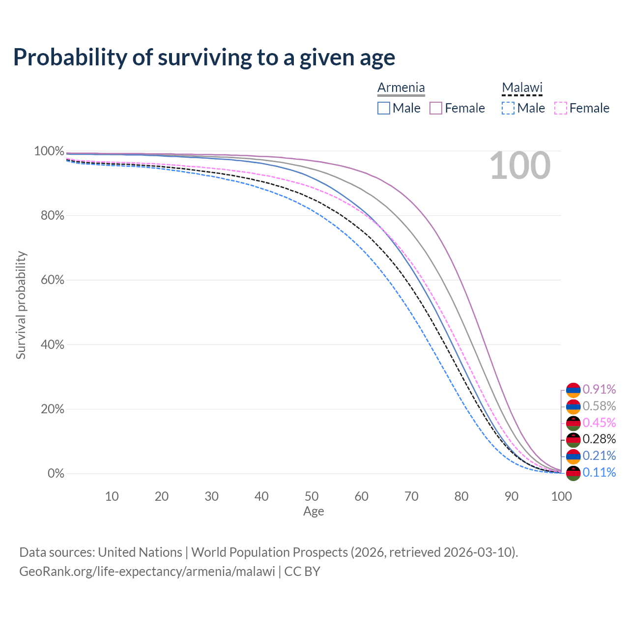 This life expectancy calculator shows the odds of living to 100, 95, 90, and below based on current age for both males and females in Armenia and Malawi, along with mean and median age of death. The calculations are based on the 2026 life tables (actuarial tables) from the UN World Population Prospects.