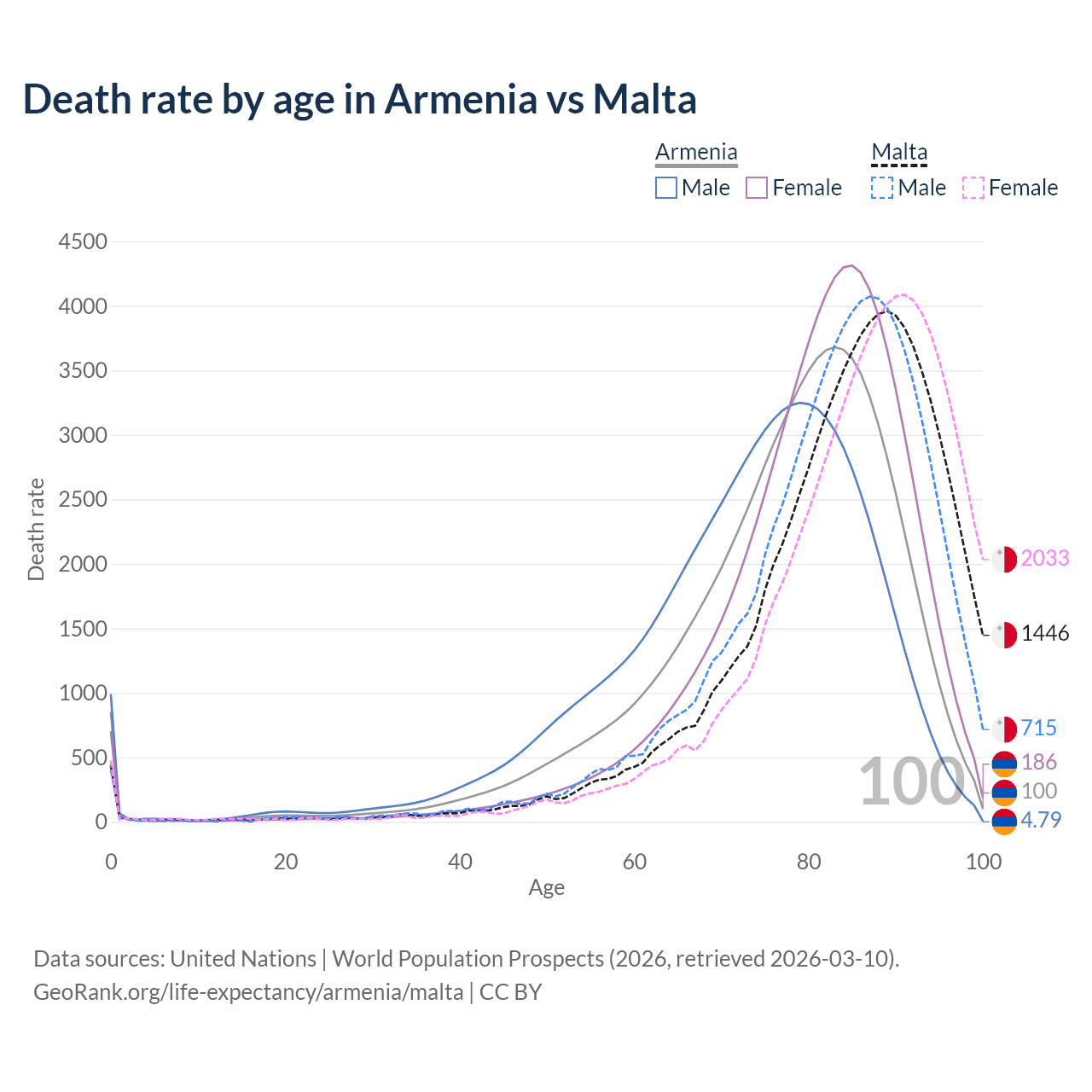 This life expectancy calculator shows the odds of living to 100, 95, 90, and below based on current age for both males and females in Armenia and Malta, along with mean and median age of death. The calculations are based on the 2026 life tables (actuarial tables) from the UN World Population Prospects.