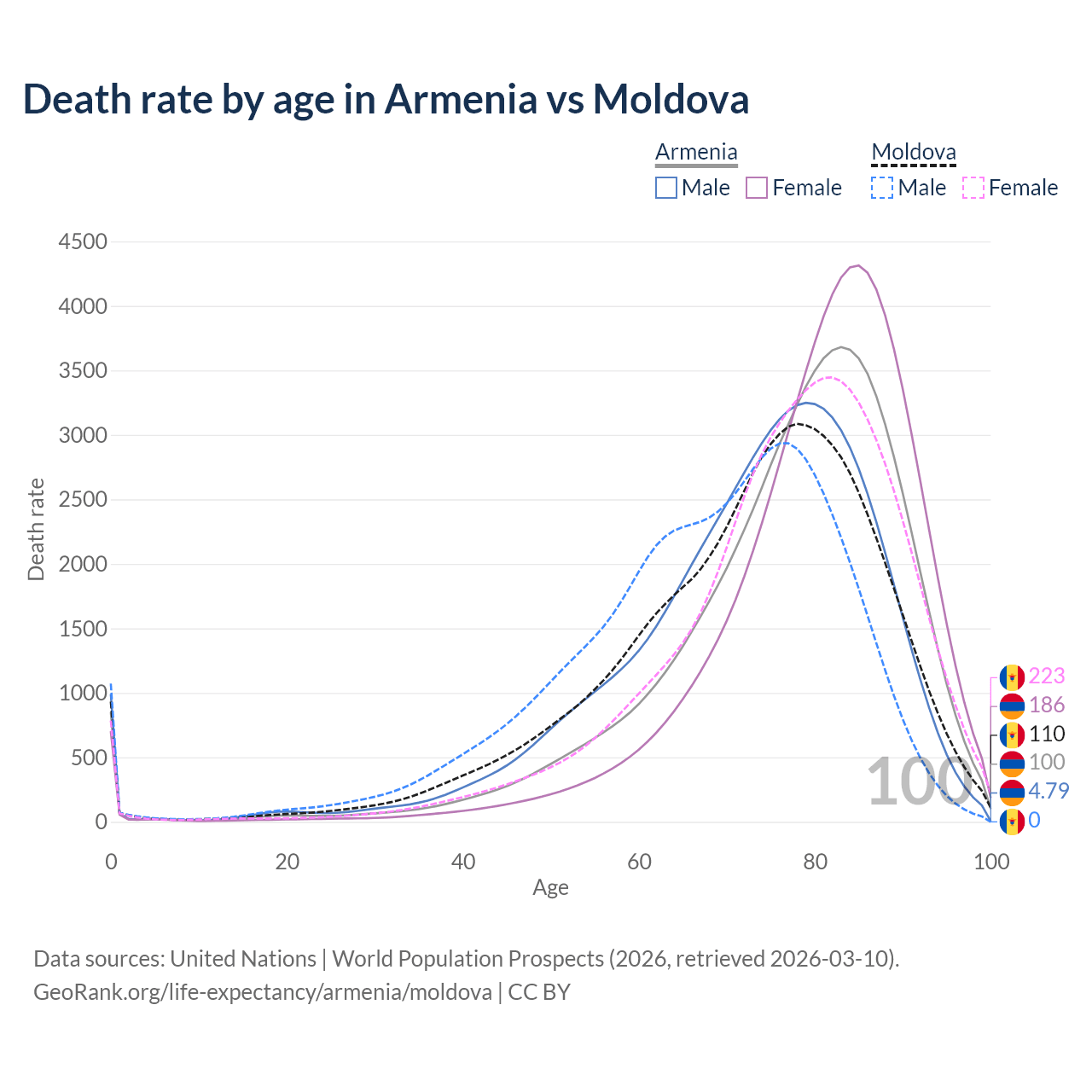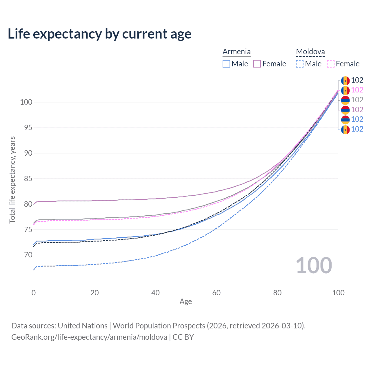 This life expectancy calculator shows the odds of living to 100, 95, 90, and below based on current age for both males and females in Armenia and Moldova, along with mean and median age of death. The calculations are based on the 2026 life tables (actuarial tables) from the UN World Population Prospects.