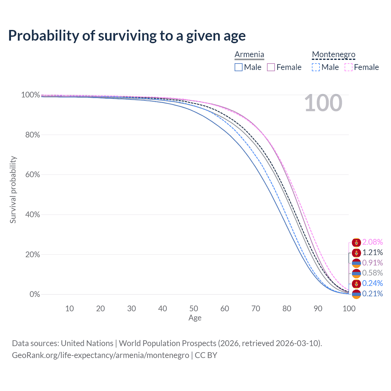 This life expectancy calculator shows the odds of living to 100, 95, 90, and below based on current age for both males and females in Armenia and Montenegro, along with mean and median age of death. The calculations are based on the 2026 life tables (actuarial tables) from the UN World Population Prospects.