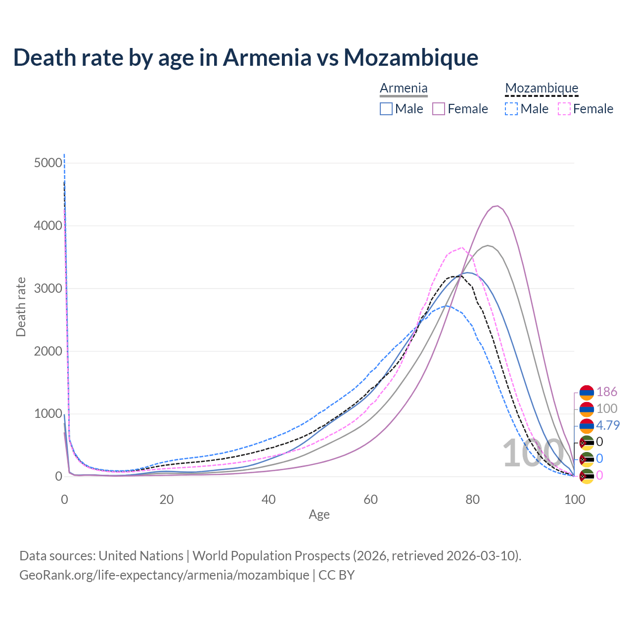 In Armenia, the most common age of death is 83, compared to 0 in Mozambique. The median age of death is 79.4 in Armenia and 71.2 in Mozambique, meaning only half of each cohort is expected to live past that age.