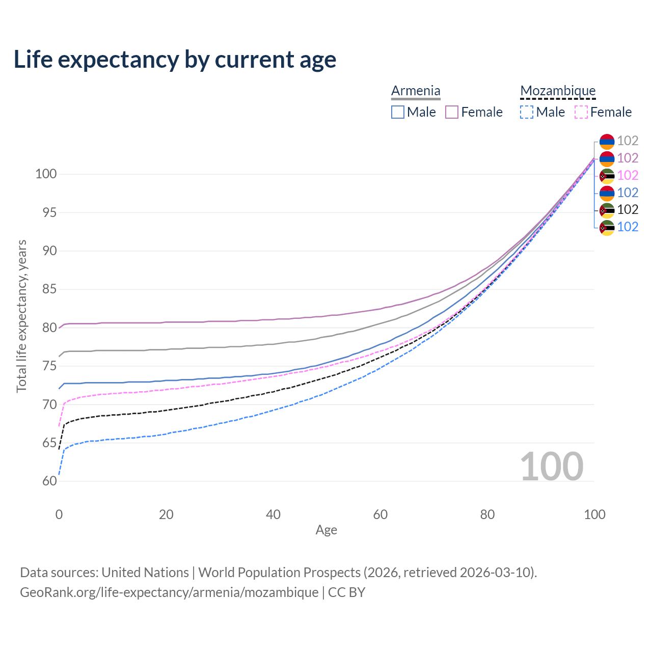 This life expectancy calculator shows the odds of living to 100, 95, 90, and below based on current age for both males and females in Armenia and Mozambique, along with mean and median age of death. The calculations are based on the 2026 life tables (actuarial tables) from the UN World Population Prospects.