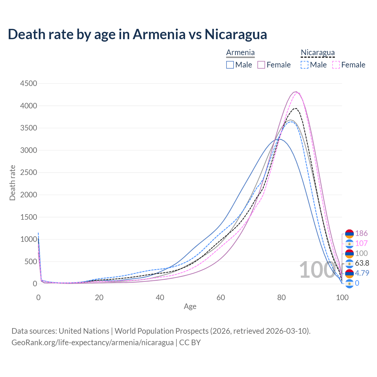 In Armenia, the most common age of death is 83, compared to 85 in Nicaragua. The median age of death is 79.4 in Armenia and 79.9 in Nicaragua, meaning only half of each cohort is expected to live past that age.