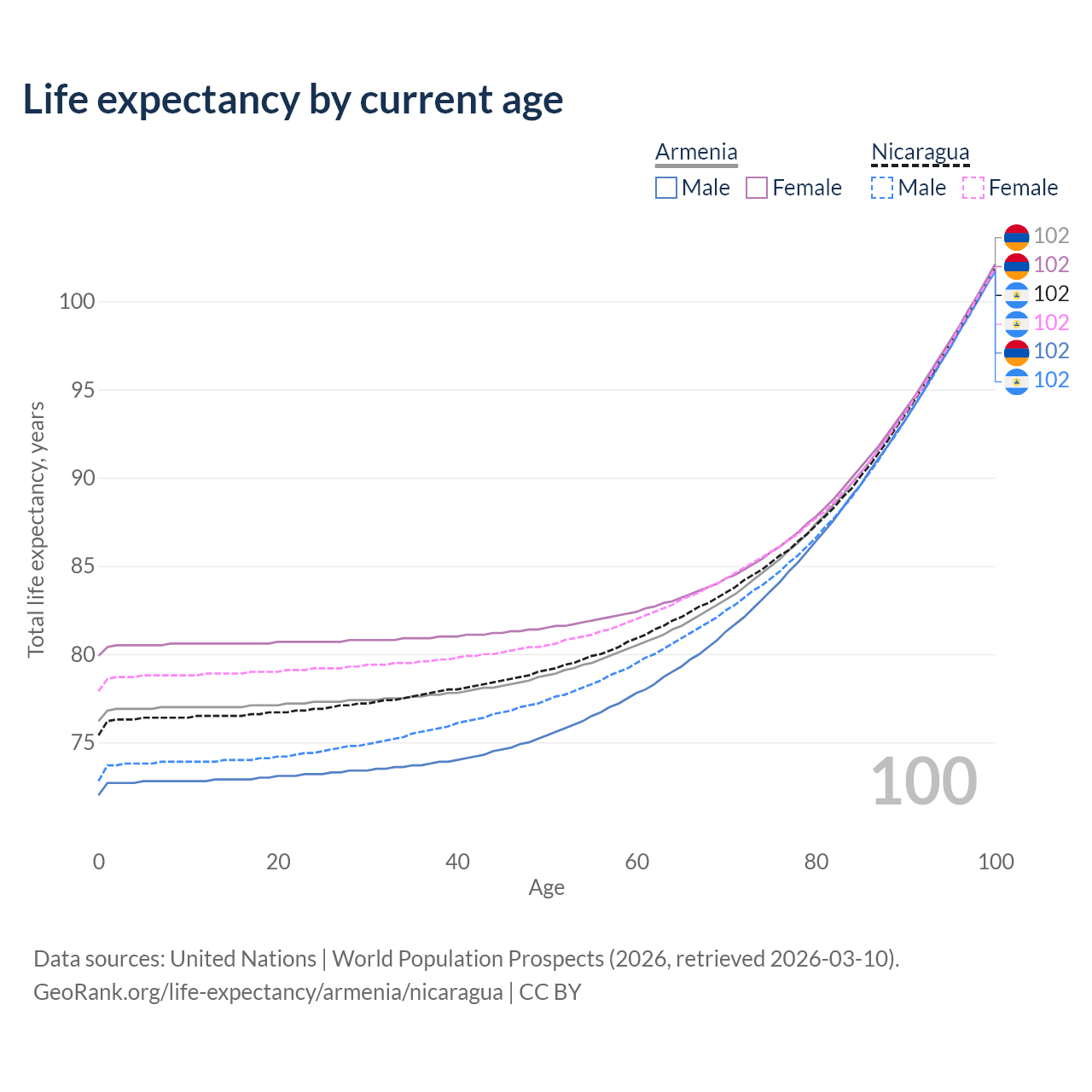 This life expectancy calculator shows the odds of living to 100, 95, 90, and below based on current age for both males and females in Armenia and Nicaragua, along with mean and median age of death. The calculations are based on the 2026 life tables (actuarial tables) from the UN World Population Prospects.