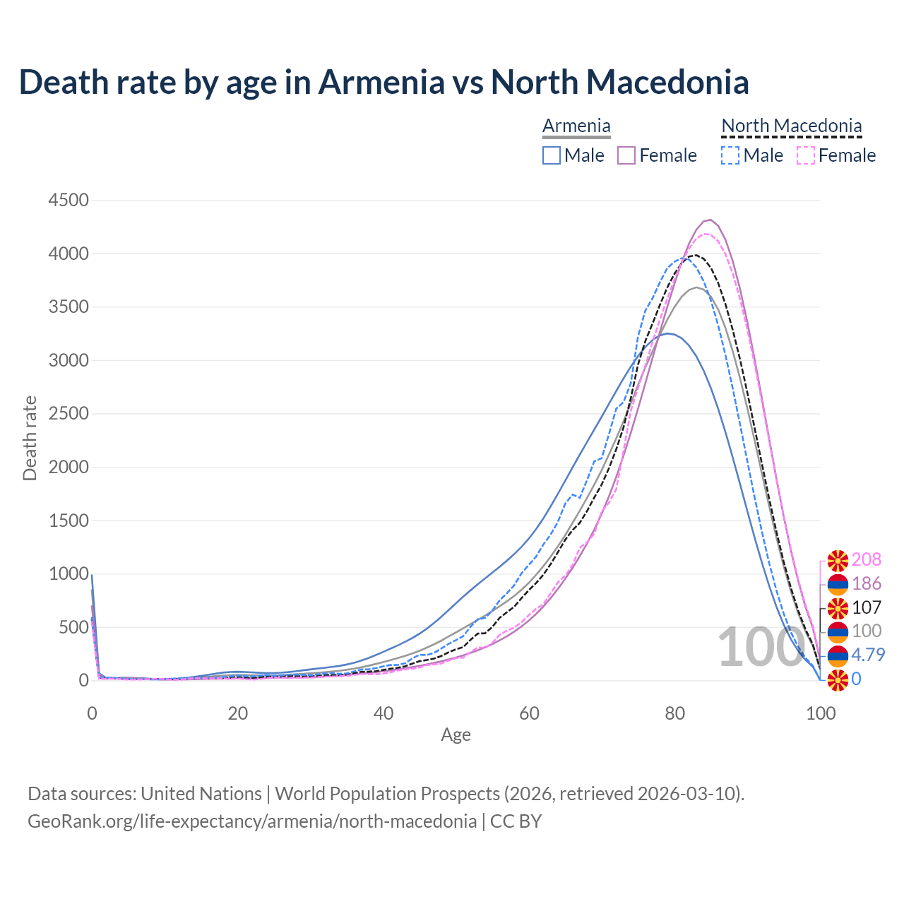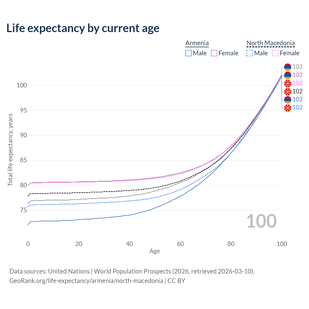 This life expectancy calculator shows the odds of living to 100, 95, 90, and below based on current age for both males and females in Armenia and North Macedonia, along with mean and median age of death. The calculations are based on the 2026 life tables (actuarial tables) from the UN World Population Prospects.