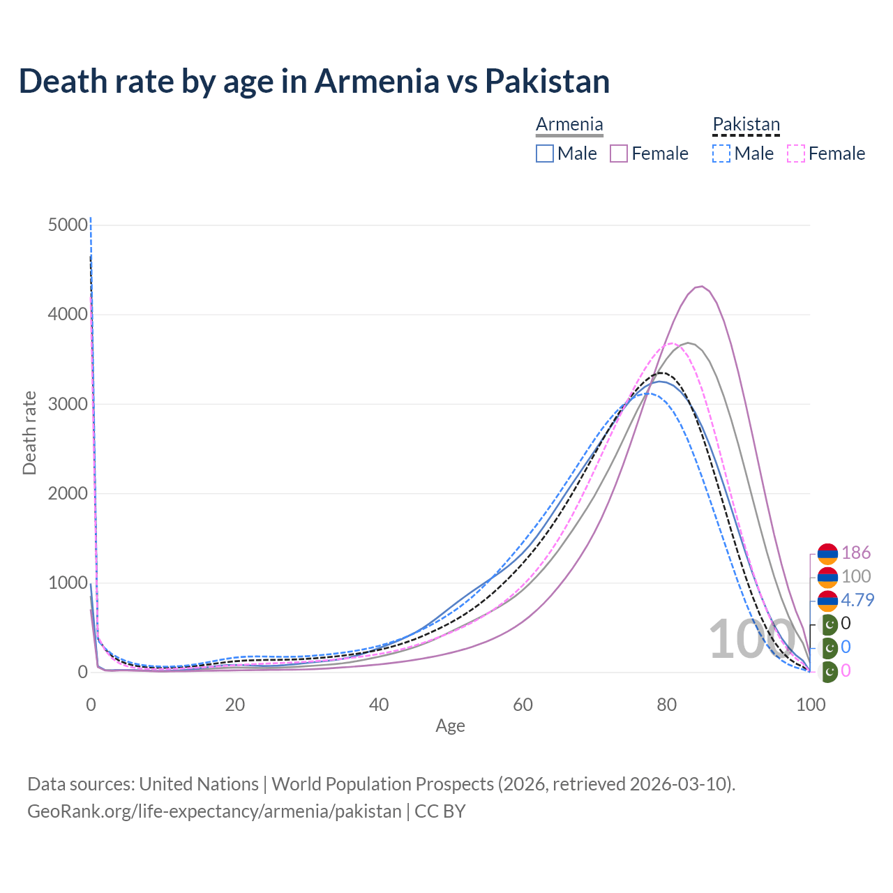 This life expectancy calculator shows the odds of living to 100, 95, 90, and below based on current age for both males and females in Armenia and Pakistan, along with mean and median age of death. The calculations are based on the 2026 life tables (actuarial tables) from the UN World Population Prospects.