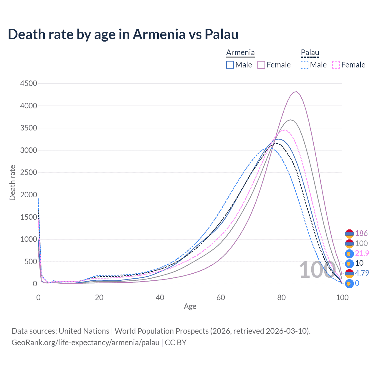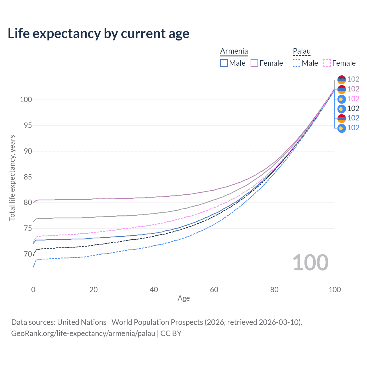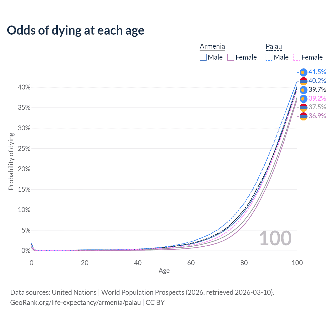 This life expectancy calculator shows the odds of living to 100, 95, 90, and below based on current age for both males and females in Armenia and Palau, along with mean and median age of death. The calculations are based on the 2026 life tables (actuarial tables) from the UN World Population Prospects.
