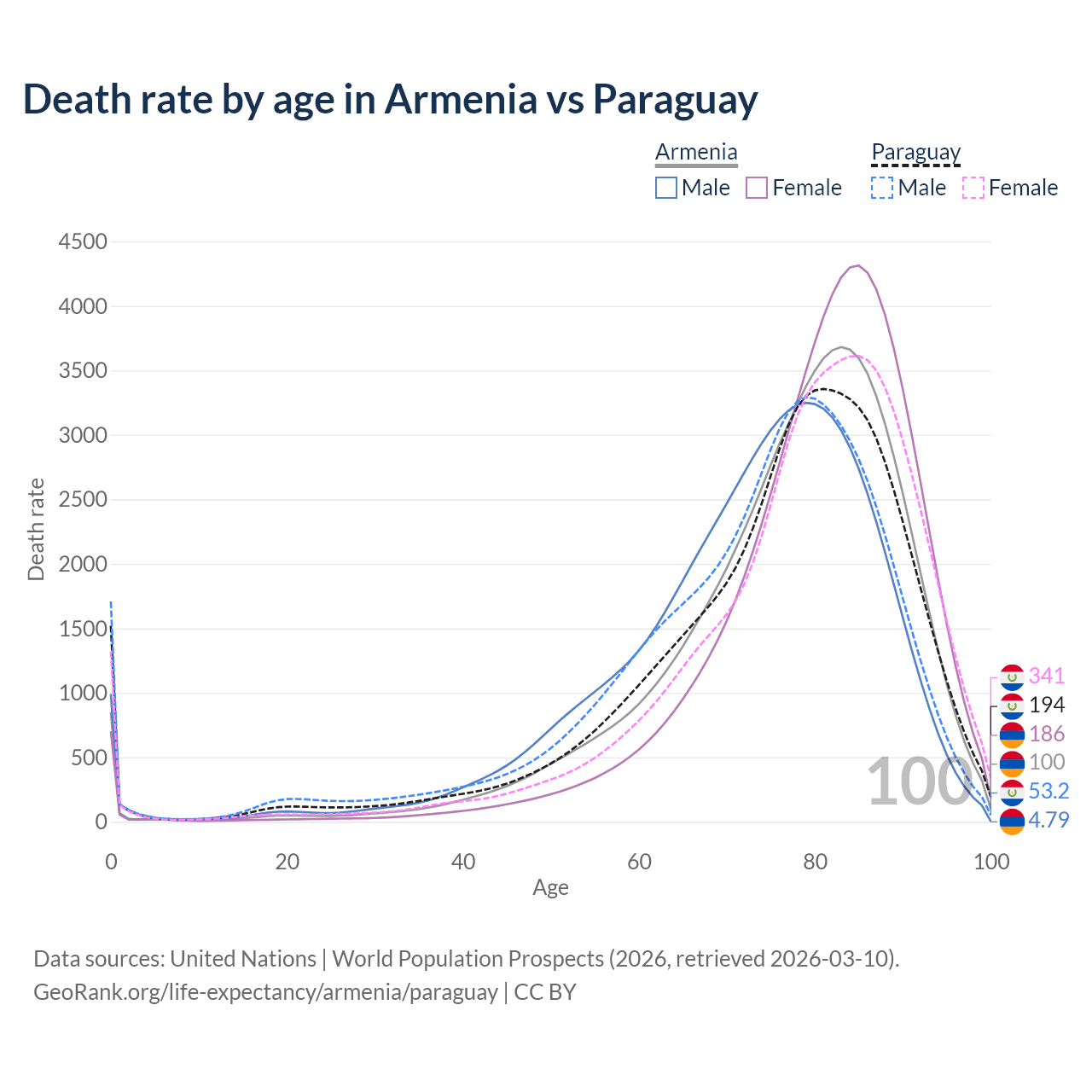 This life expectancy calculator shows the odds of living to 100, 95, 90, and below based on current age for both males and females in Armenia and Paraguay, along with mean and median age of death. The calculations are based on the 2026 life tables (actuarial tables) from the UN World Population Prospects.