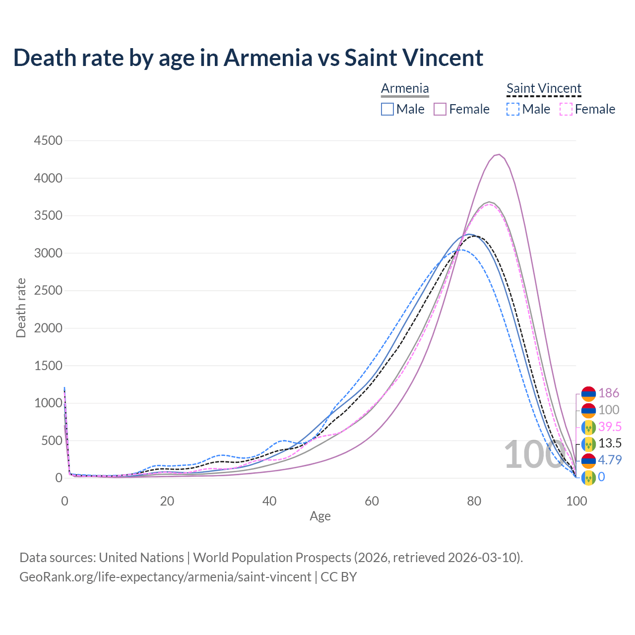 In Armenia, the most common age of death is 83, compared to 80 in Saint Vincent. The median age of death is 79.4 in Armenia and 75.6 in Saint Vincent, meaning only half of each cohort is expected to live past that age.