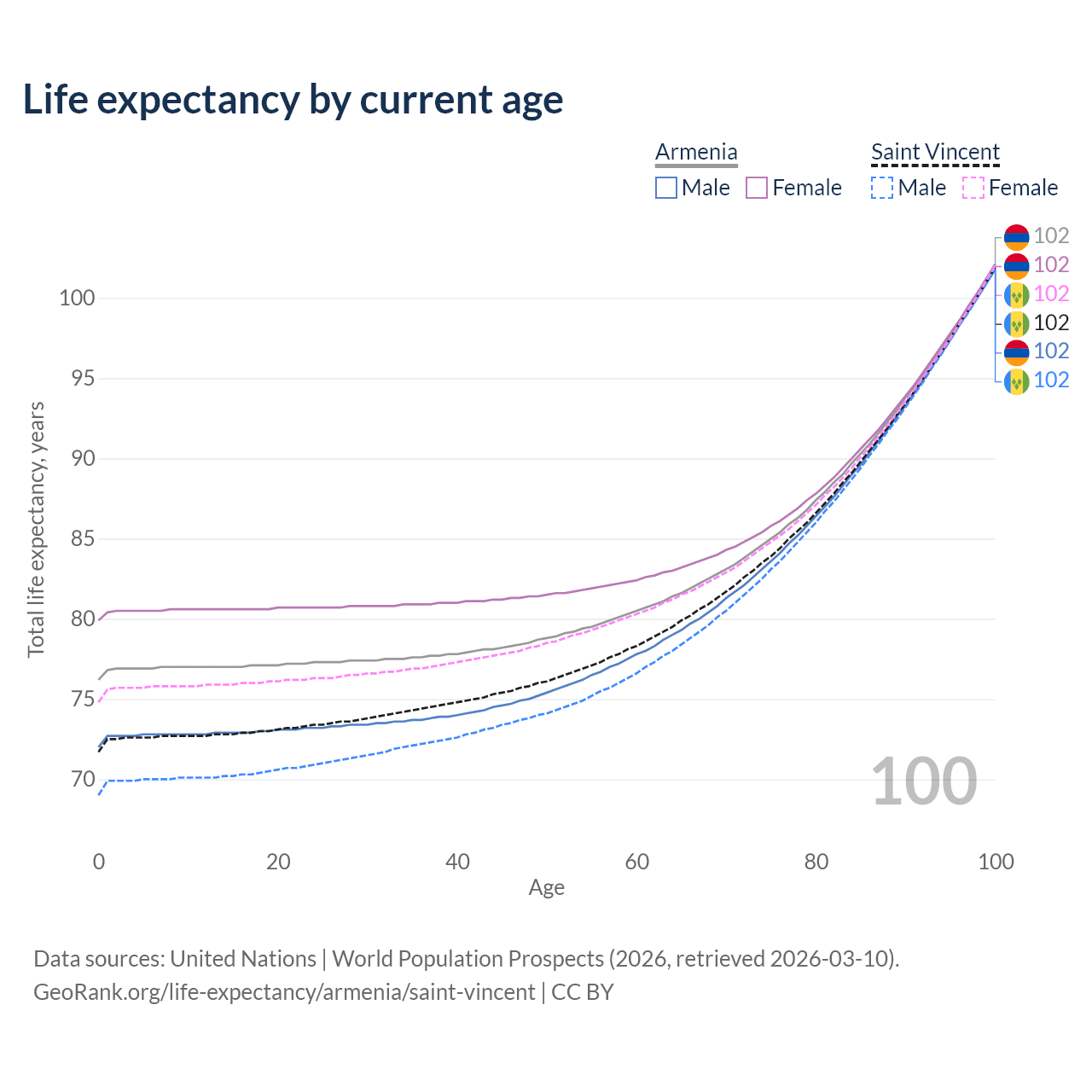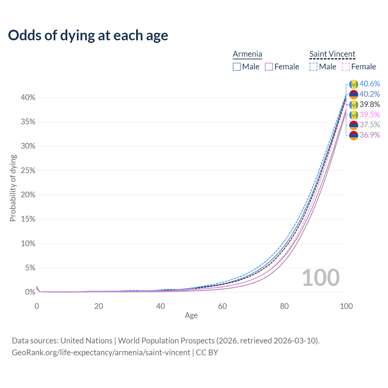 This life expectancy calculator shows the odds of living to 100, 95, 90, and below based on current age for both males and females in Armenia and Saint Vincent, along with mean and median age of death. The calculations are based on the 2026 life tables (actuarial tables) from the UN World Population Prospects.