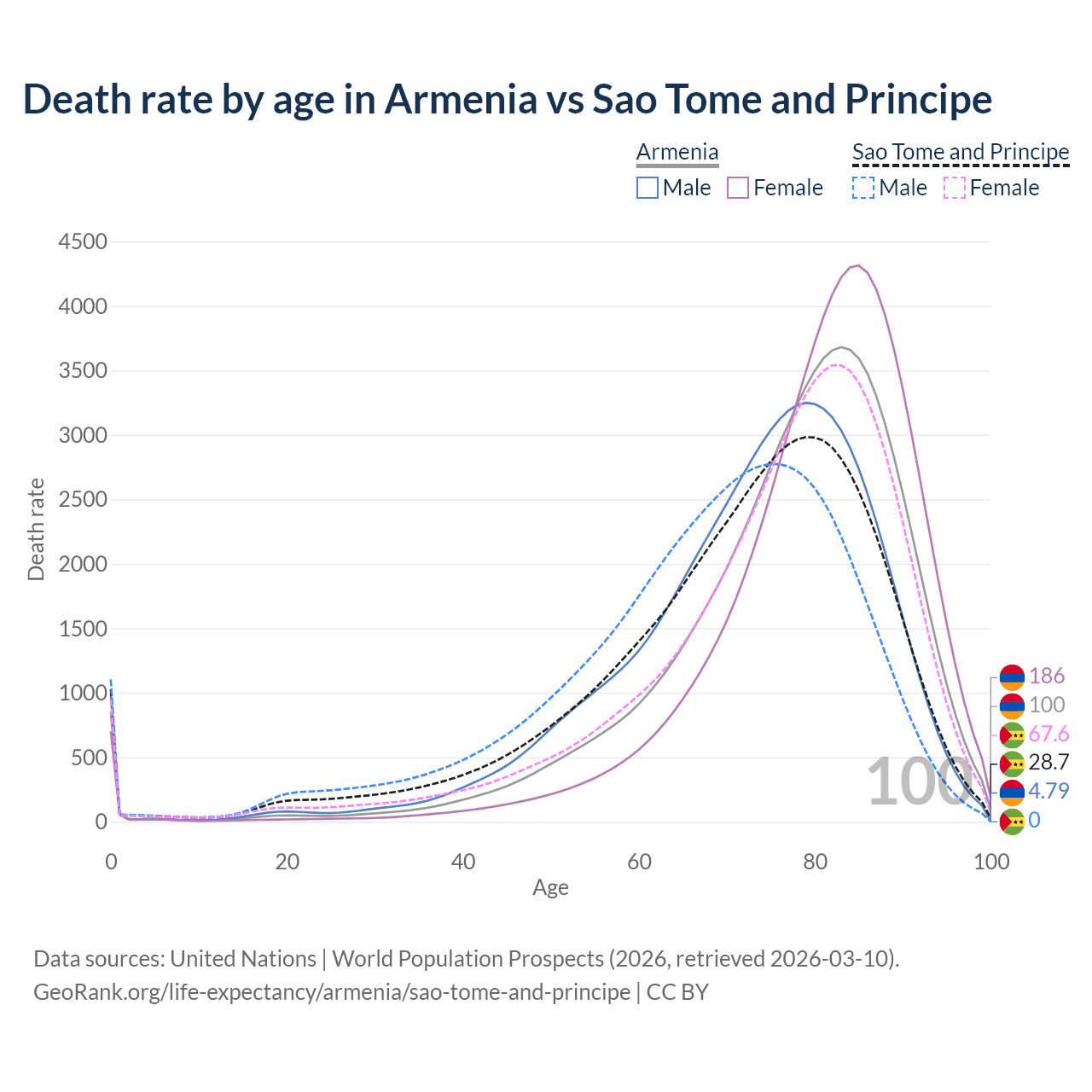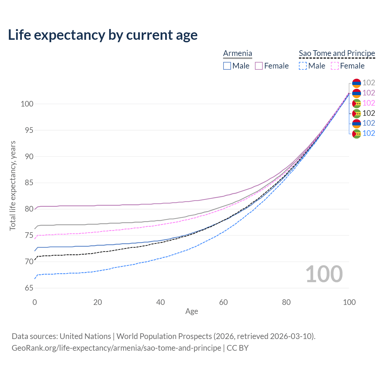 This life expectancy calculator shows the odds of living to 100, 95, 90, and below based on current age for both males and females in Armenia and Sao Tome and Principe, along with mean and median age of death. The calculations are based on the 2026 life tables (actuarial tables) from the UN World Population Prospects.