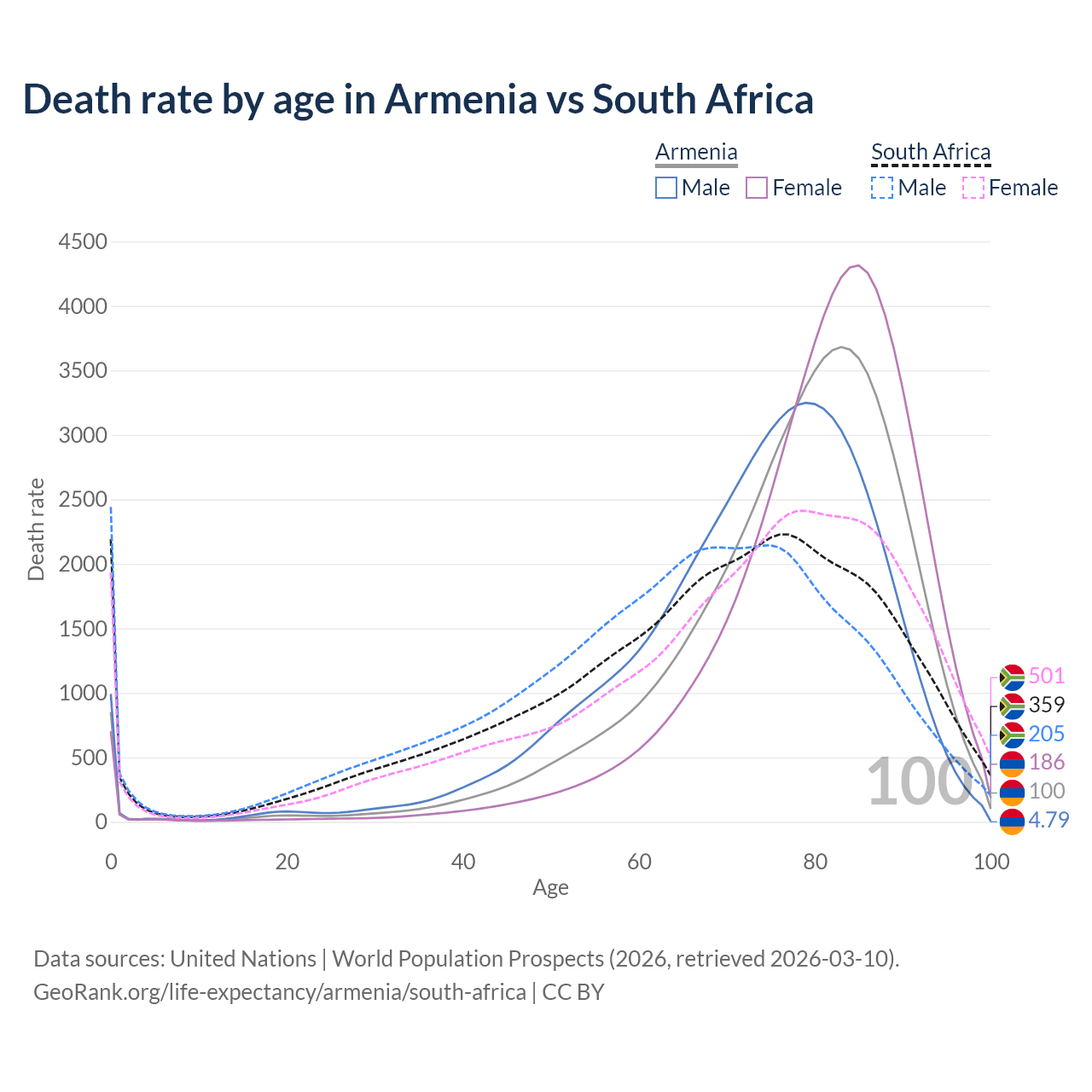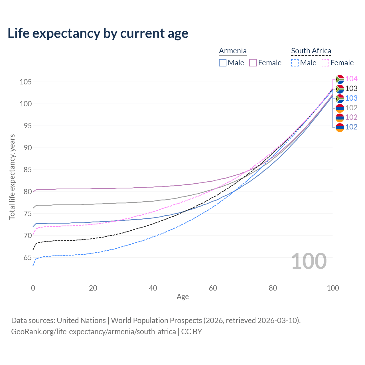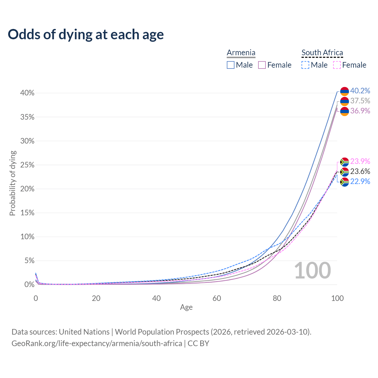 This life expectancy calculator shows the odds of living to 100, 95, 90, and below based on current age for both males and females in Armenia and South Africa, along with mean and median age of death. The calculations are based on the 2026 life tables (actuarial tables) from the UN World Population Prospects.
