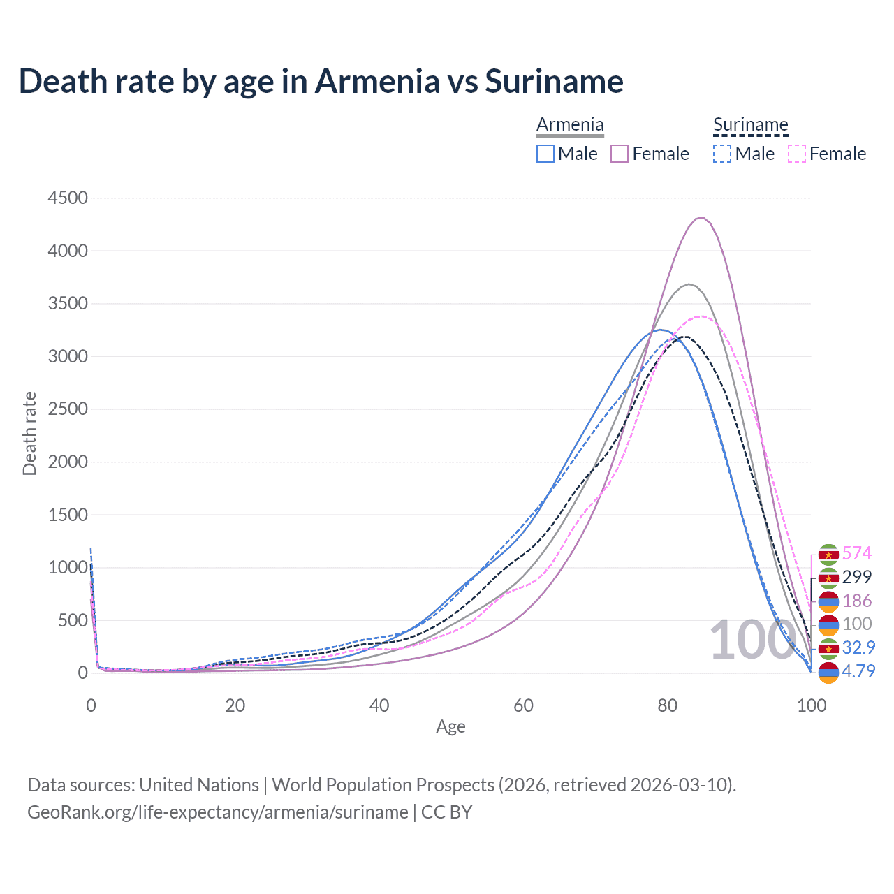 In Armenia, the most common age of death is 83, compared to 82 in Suriname. The median age of death is 79.4 in Armenia and 78 in Suriname, meaning only half of each cohort is expected to live past that age.